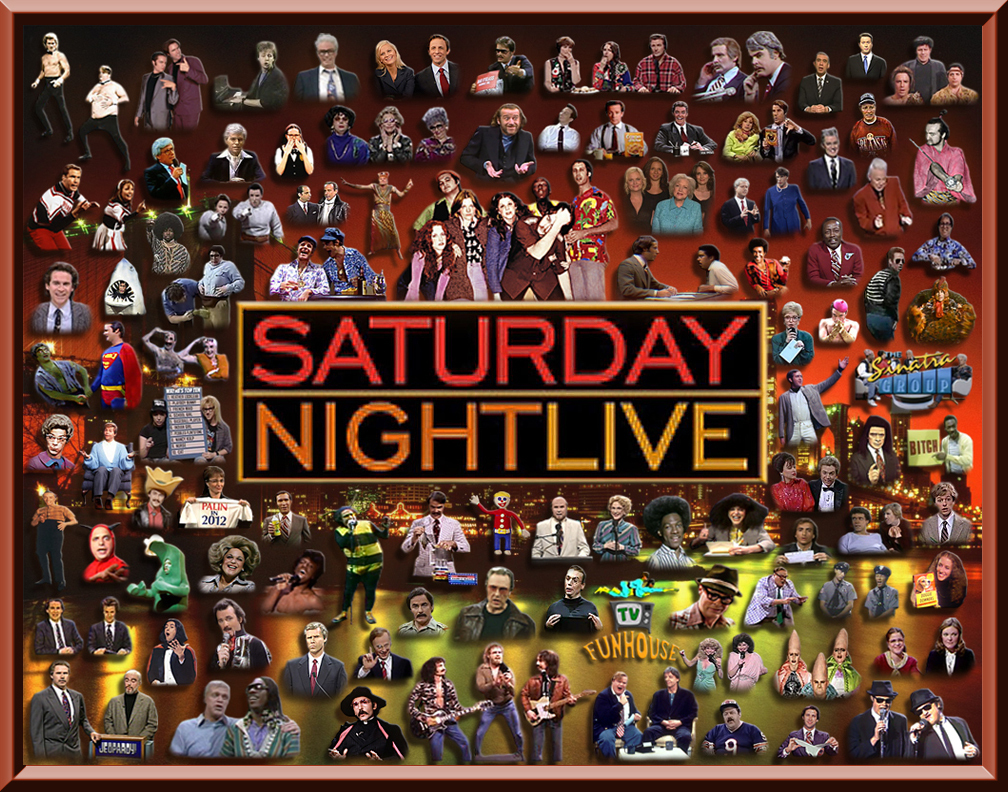 Description: A poster of a bunch of people in a room with the words saturday night live on it and a red frame.