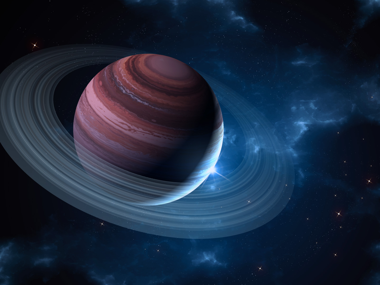Description: A saturn like object with rings around it in the sky with stars around it and a blue background with white clouds.