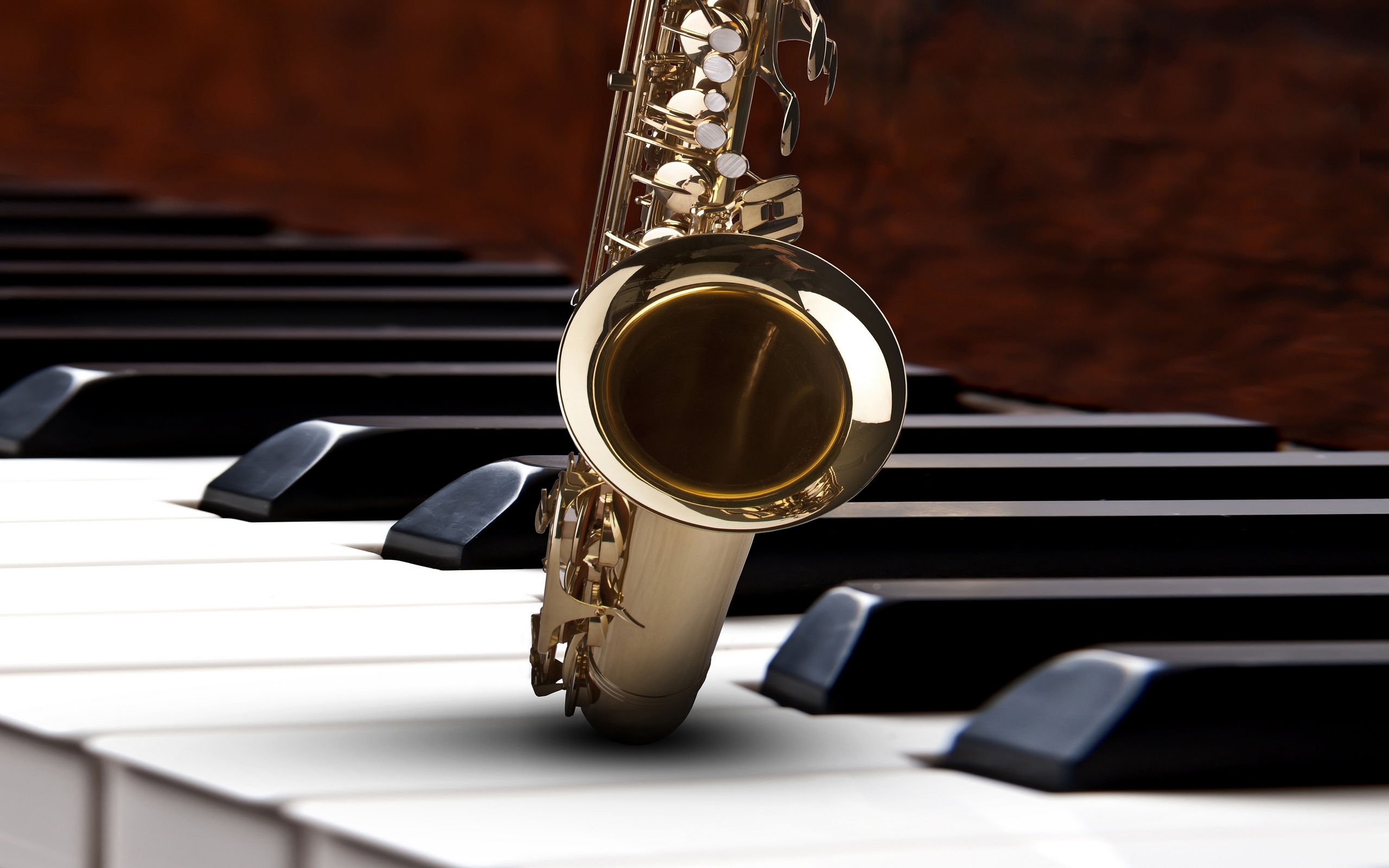 Description: A saxophone sitting on top of a piano keyboard with keys in the background of the image and a piano in the foreground.