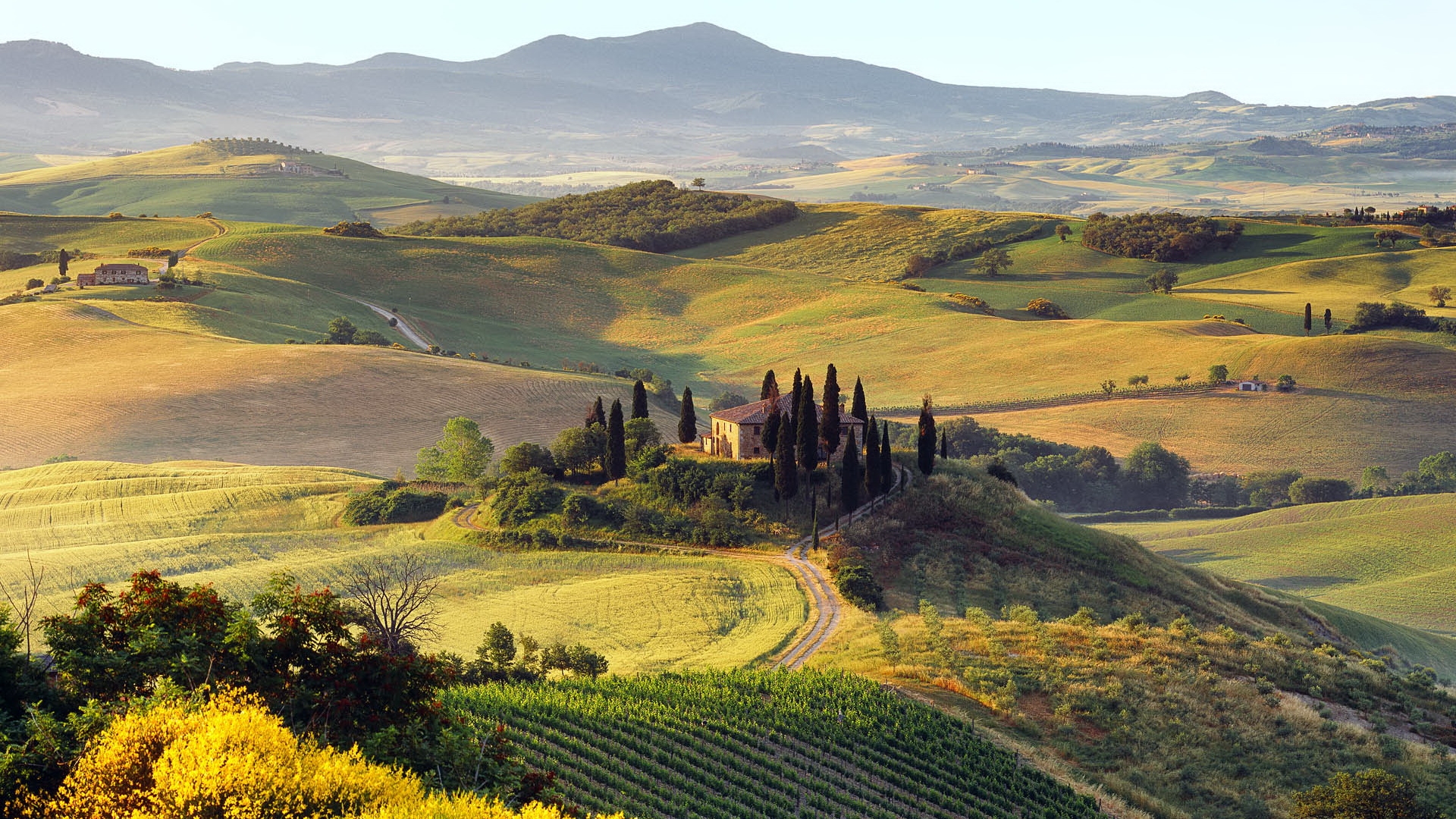 Description: A scenic view of a farm and a road in the middle of a field with mountains in the background.
