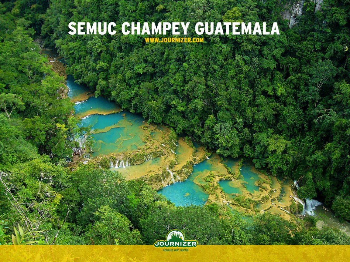 Description: A scenic view of a river surrounded by trees and a forest with a yellow border over it that says semuc chapey guatemala.