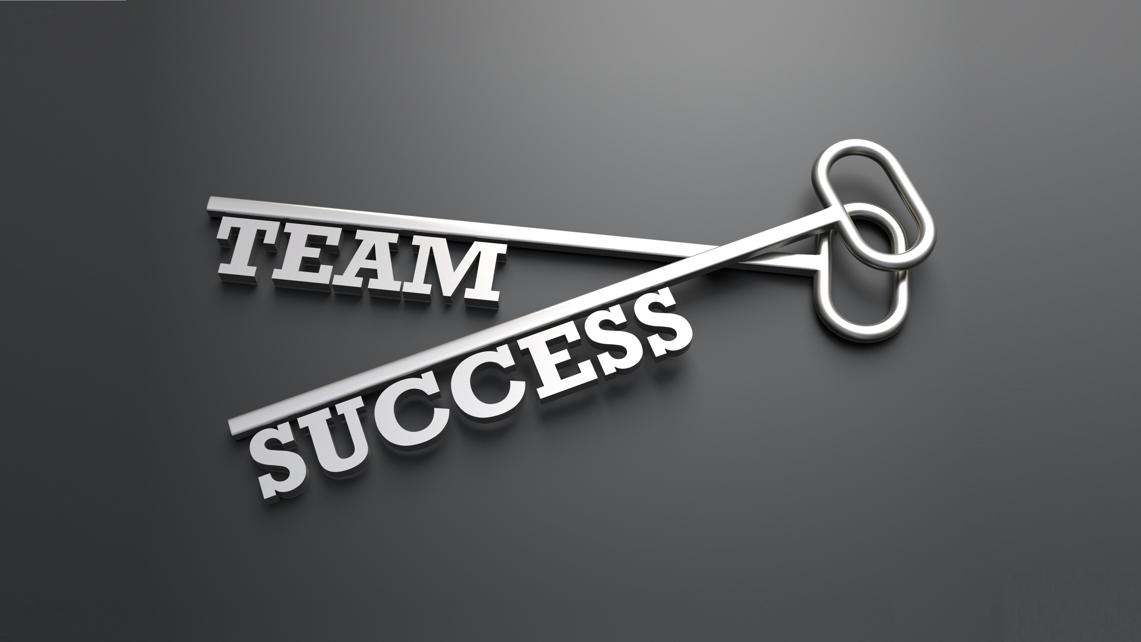 Description: A pair of scissors cutting the word team and success on a black background with a white link in the middle.