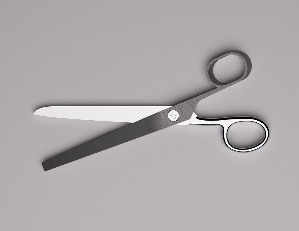 Description: A pair of scissors is shown on a gray background with a shadow of the scissors on the left side.