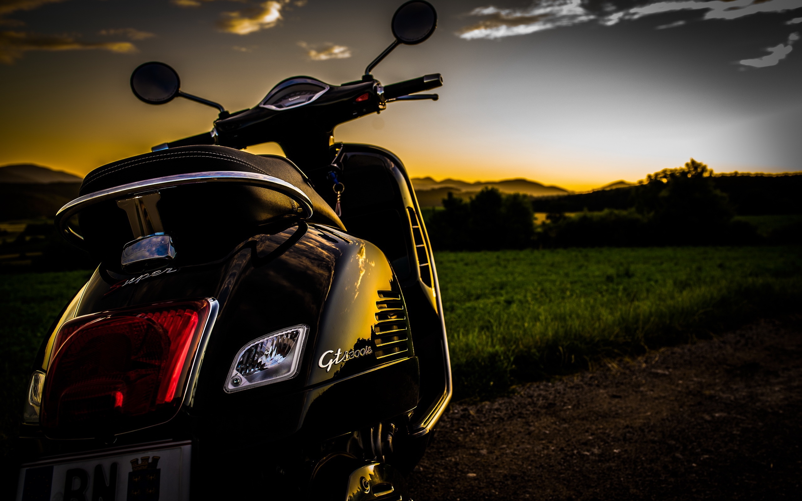 Description: A scooter parked on a dirt road in a field at sunset with the sun setting behind it.