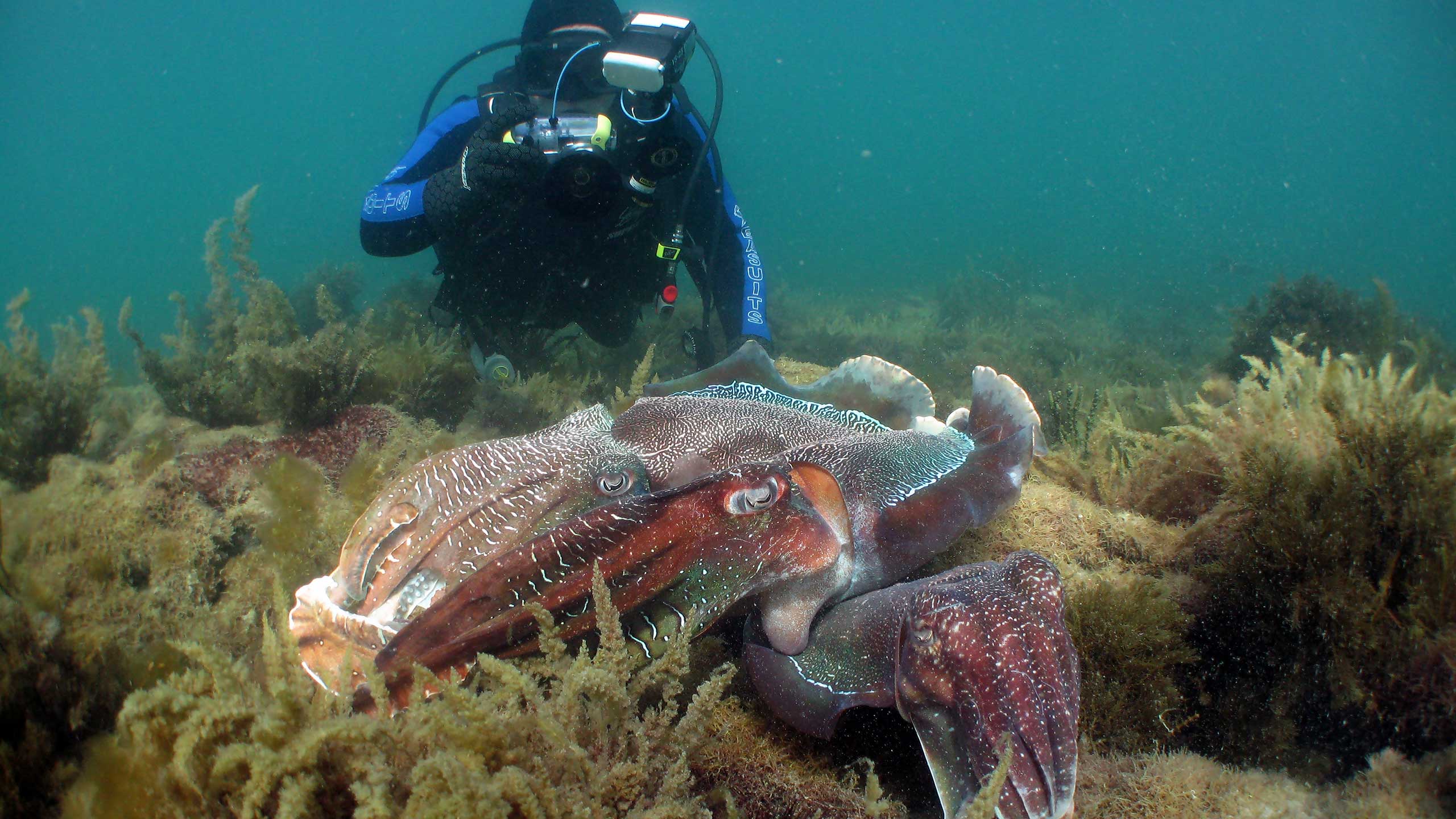 Description: A scuba diver is looking at a cuttle of squidfish in the ocean floor with a scuba diver nearby.