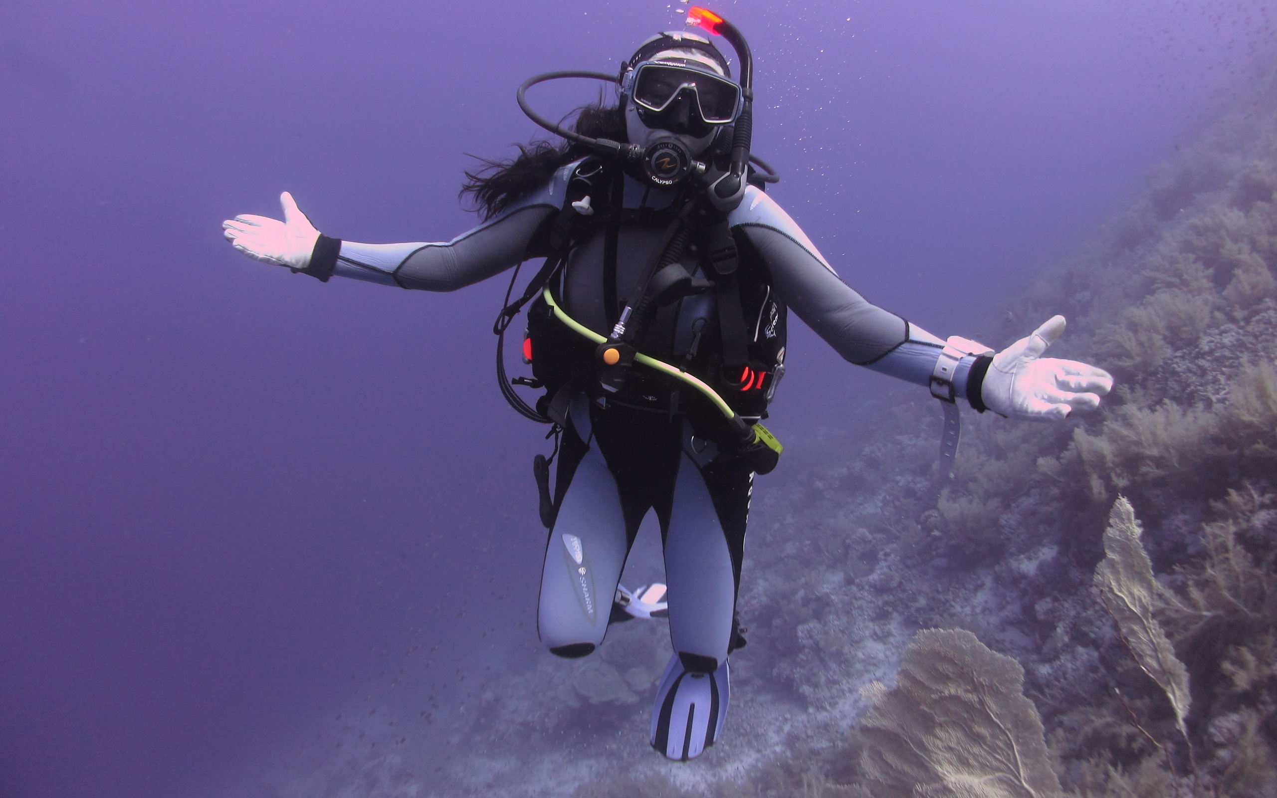 Description: A scuba diver in a full body of water with his arms outstretched out to the side of the water.