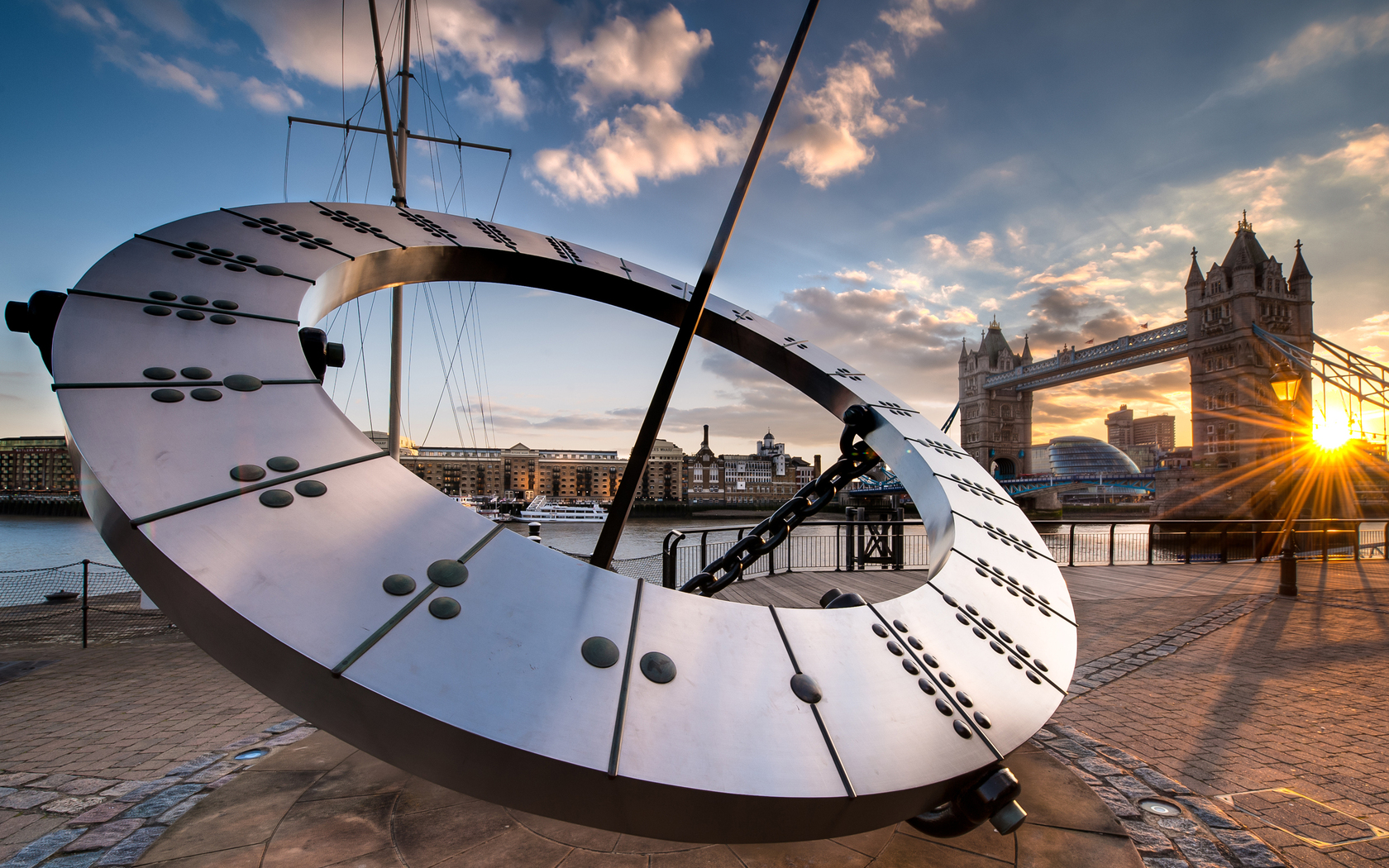 Description: A sculpture of a boat in front of a bridge and a body of water with a sunset in the background.