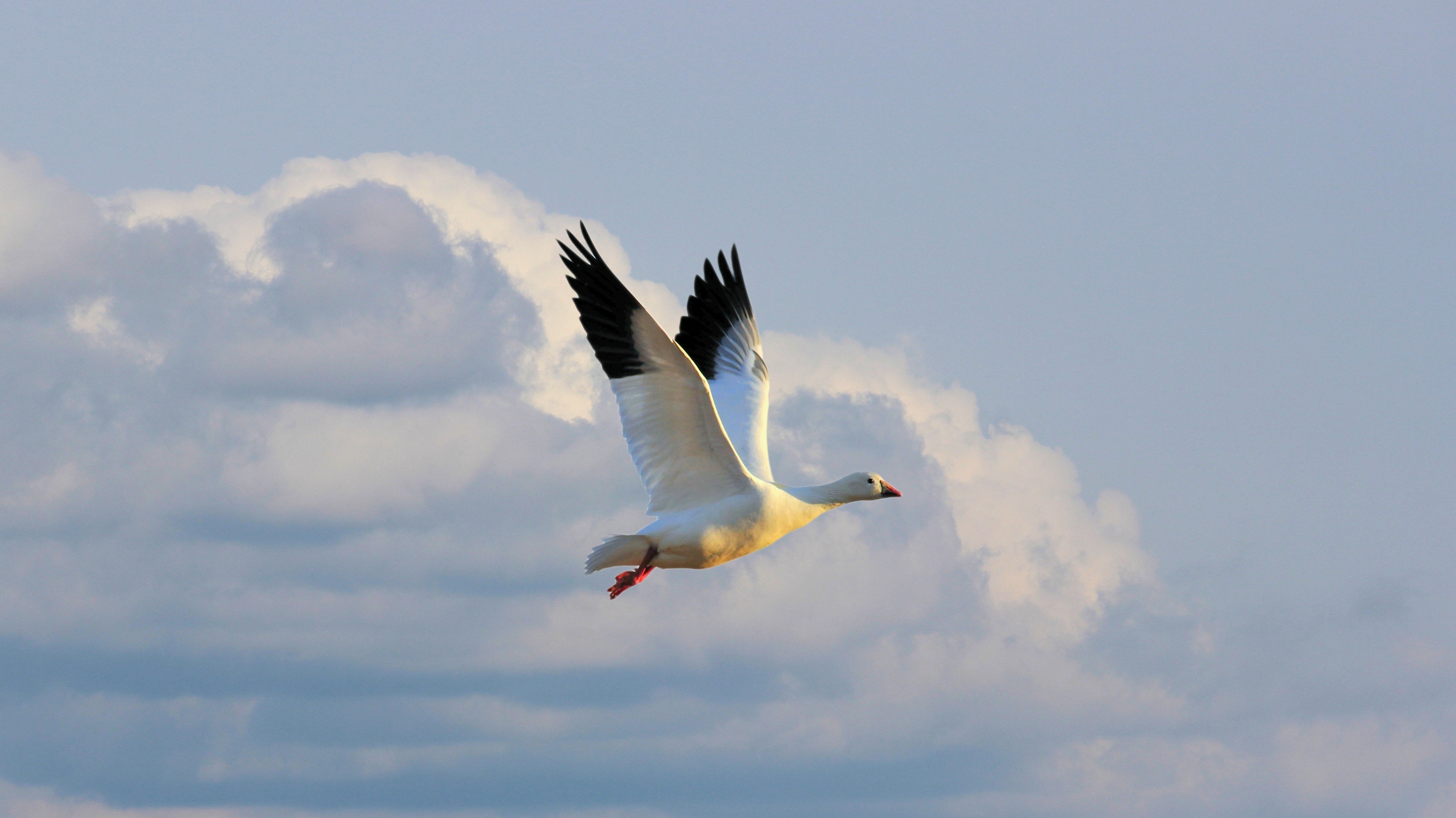 Description: A white and black bird flying in the sky with clouds in the background and a blue sky with white clouds.