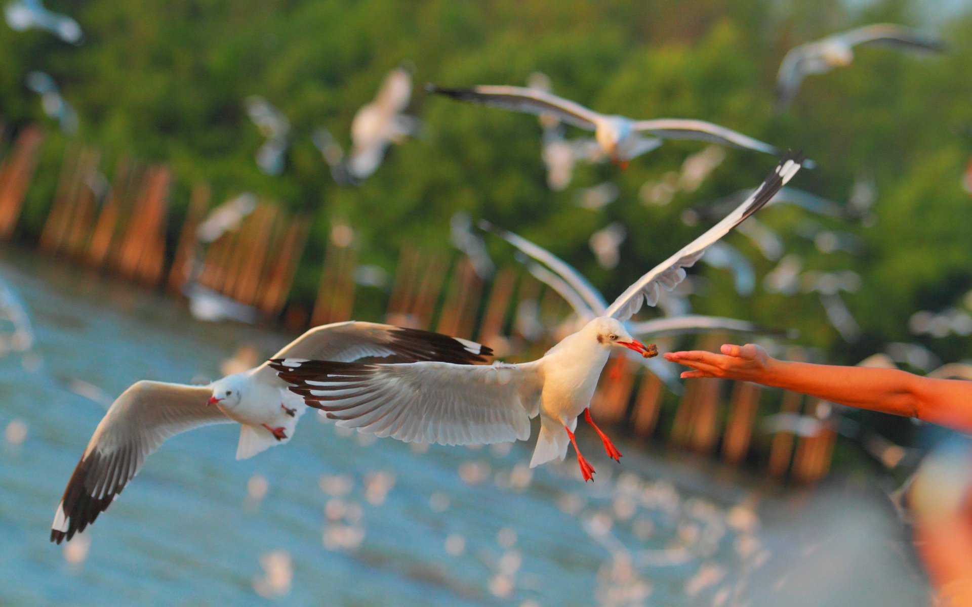 Description: A flock of seagulls flying over a body of water with trees in the background and a person holding a red handled hand.