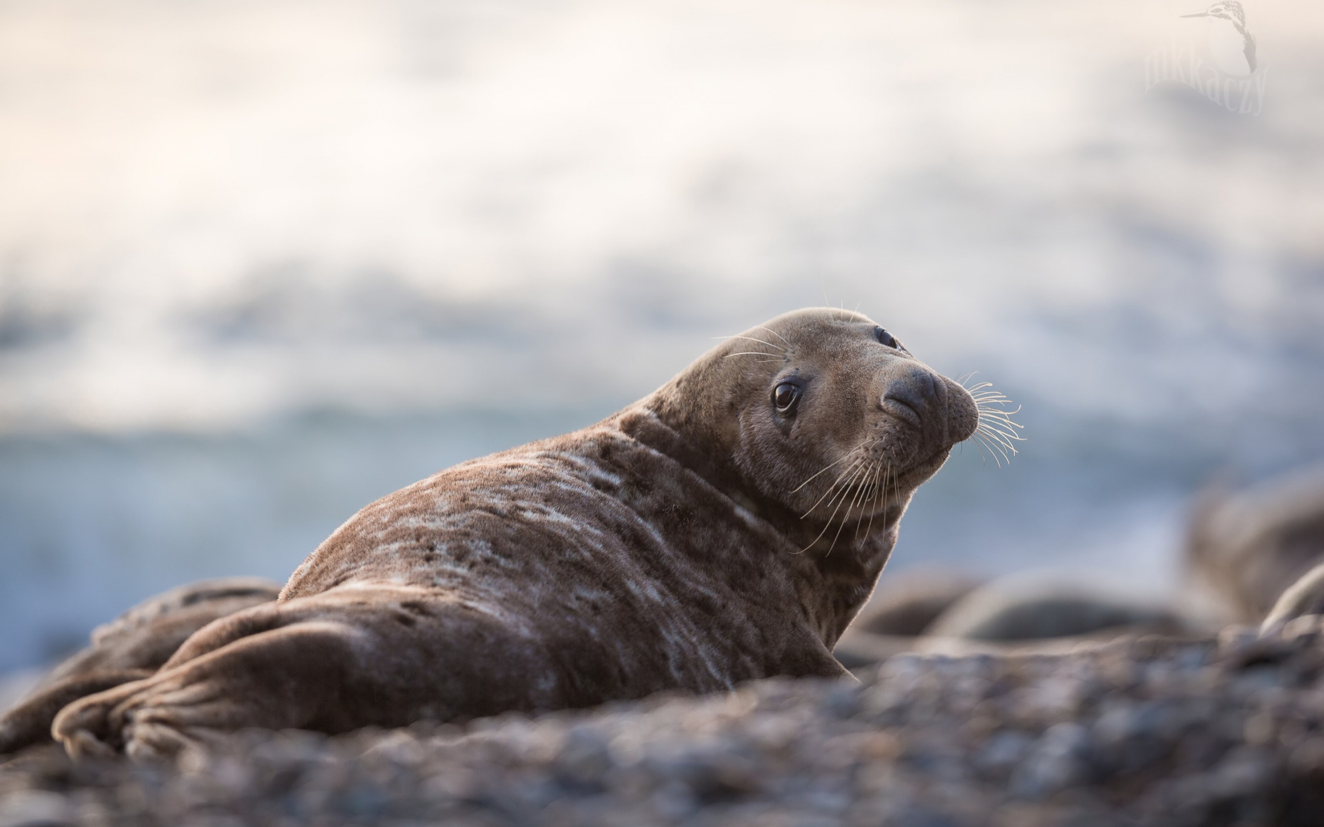Description: A seal sitting on a rock looking at the camera with a blurry background of water and clouds in the distance.
