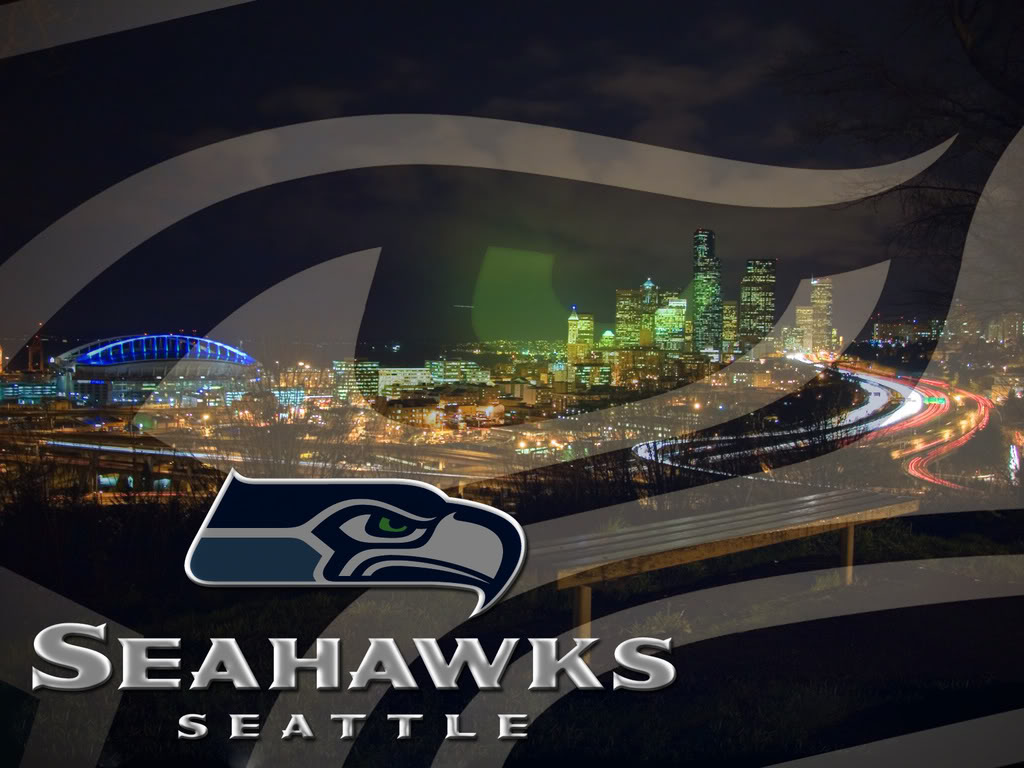 Description: A seattle skyline with the seattle sea hawks logo over it at night with the seattle skyline in the background.