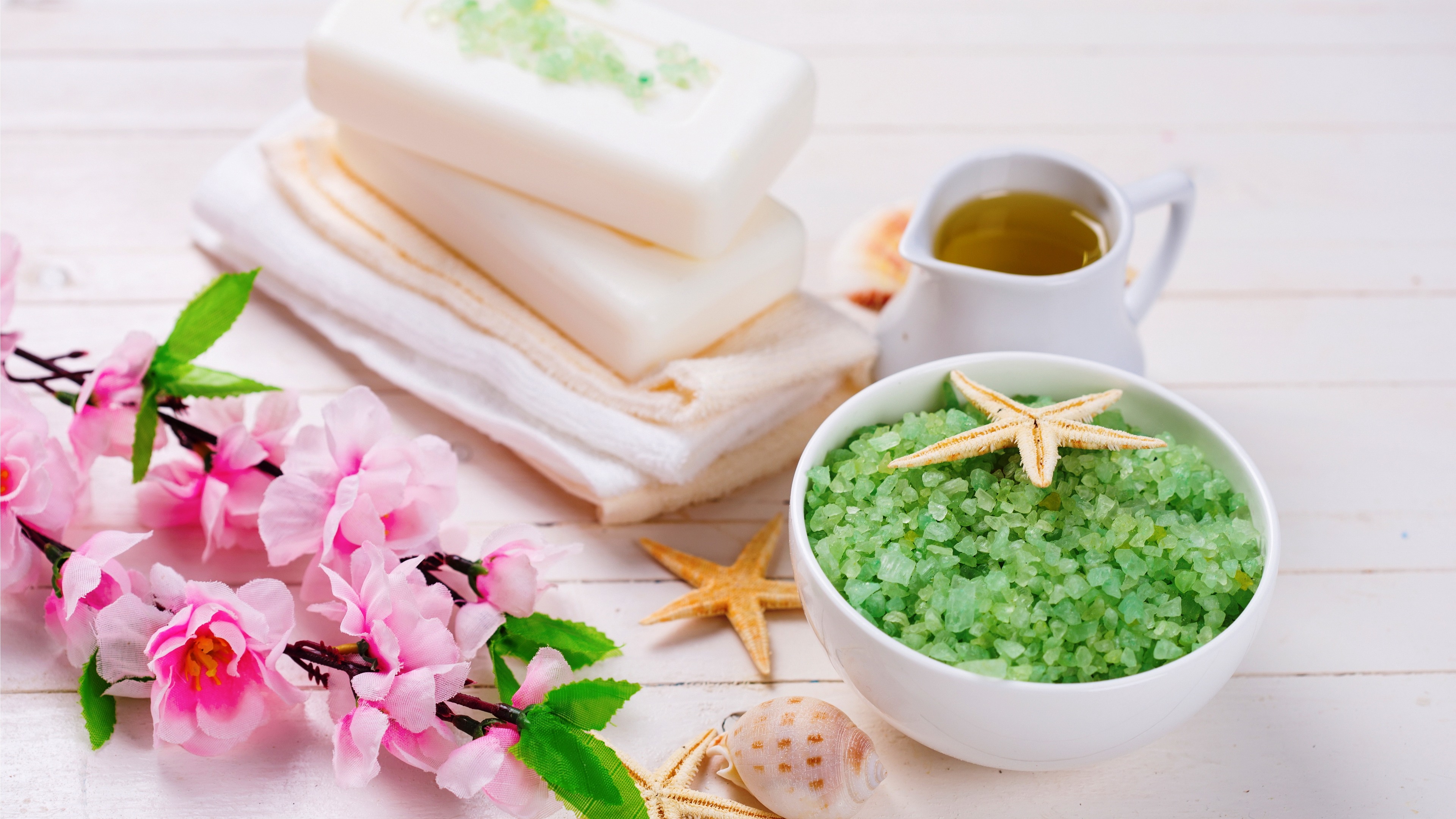 Description: A bowl of green seaweed next to a cup of tea and some flowers on a white tablecloth.
