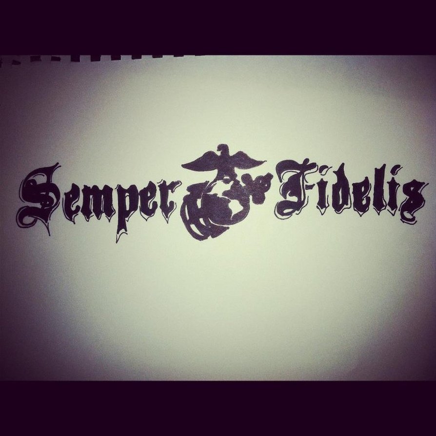 Description: A logo for a band called semper fiblis on a wall in a building in the city.