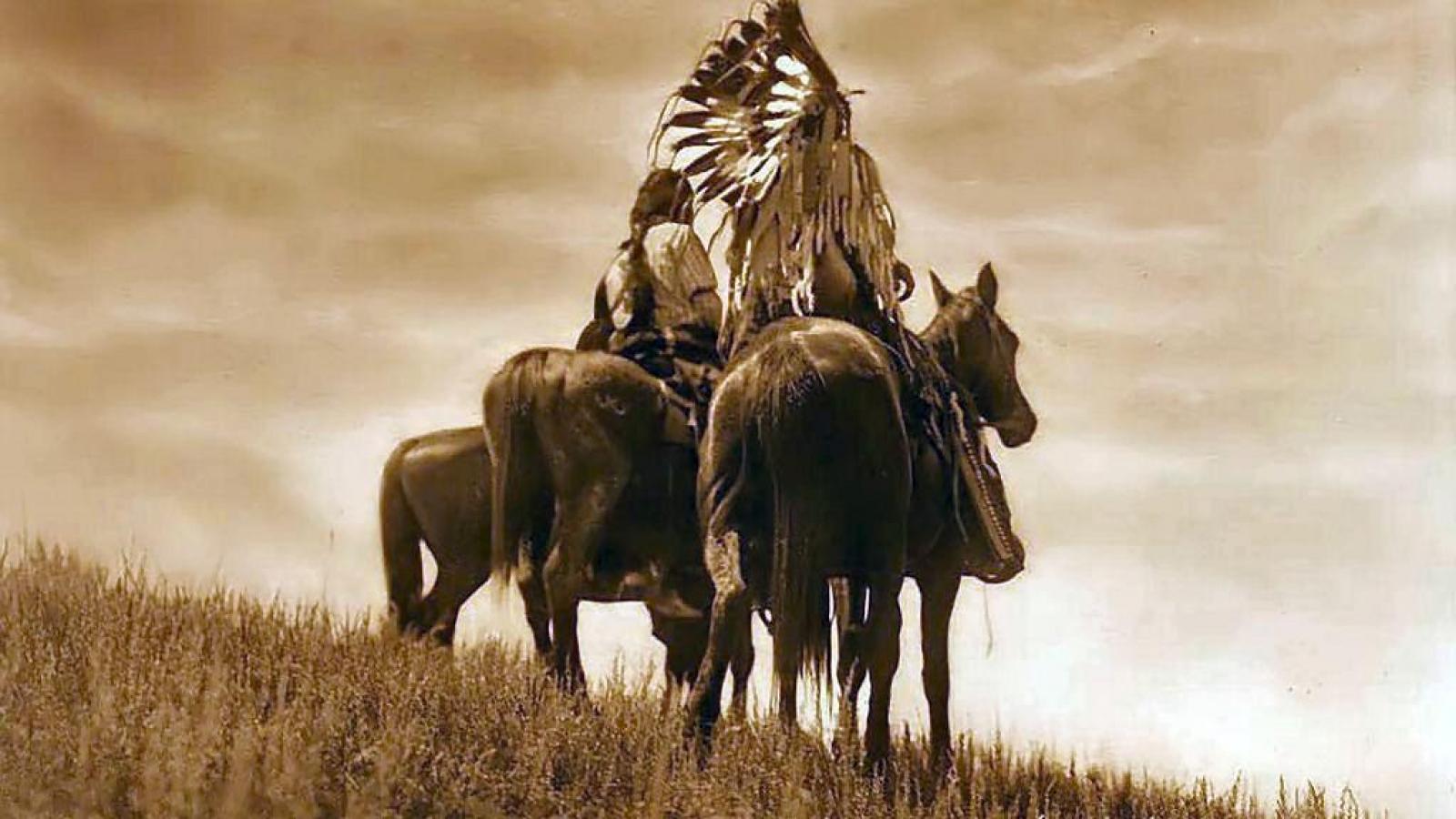 Description: A sepia photograph of a native american man on a horse with two cows in a field of grass.