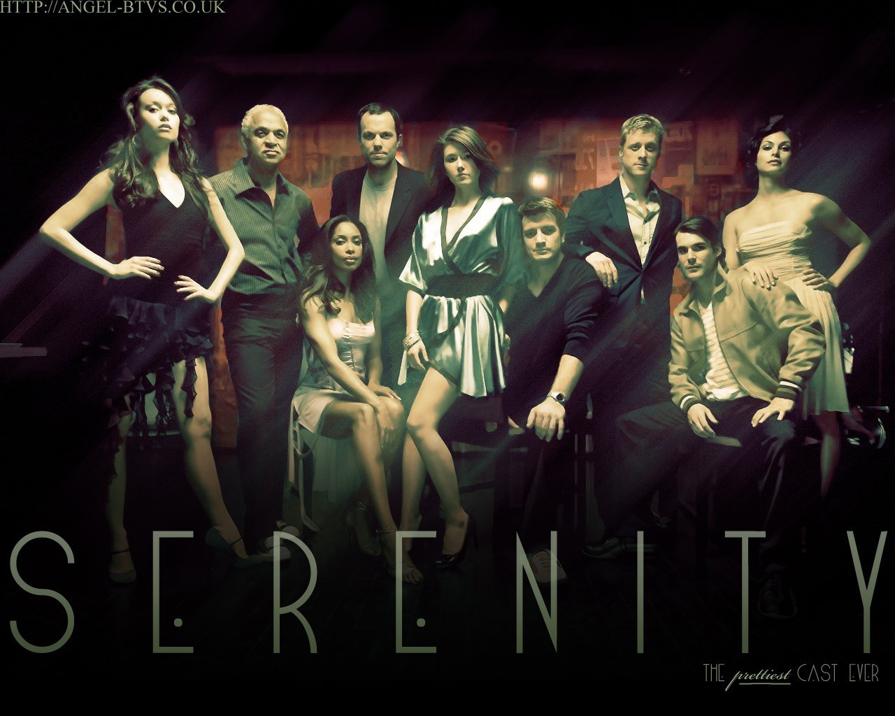 Description: A group of people standing next to each other in front of a dark background with the words serenity.