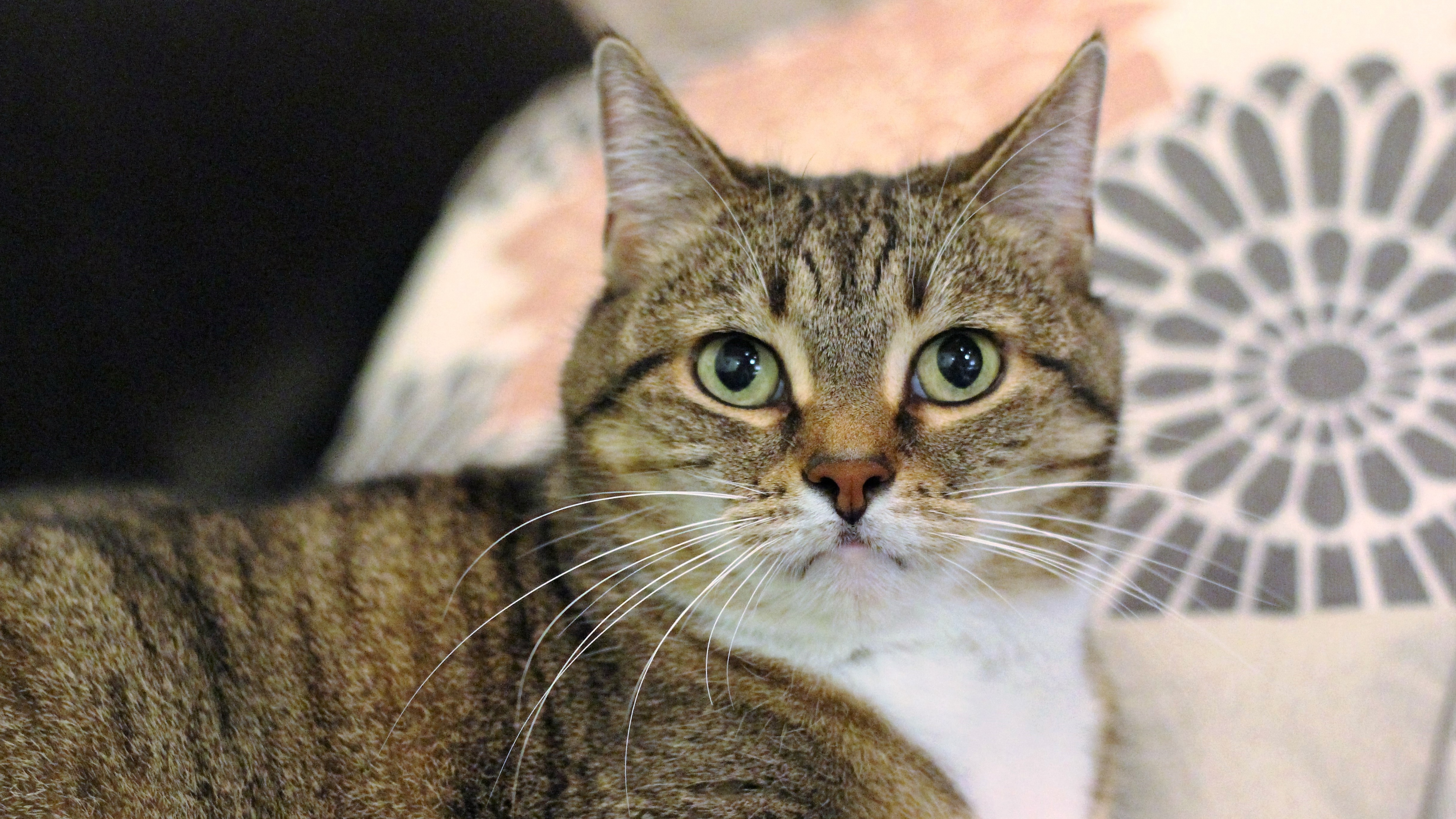 Description: A cat is laying down on a couch looking at the camera with a serious look on its face and eyes.