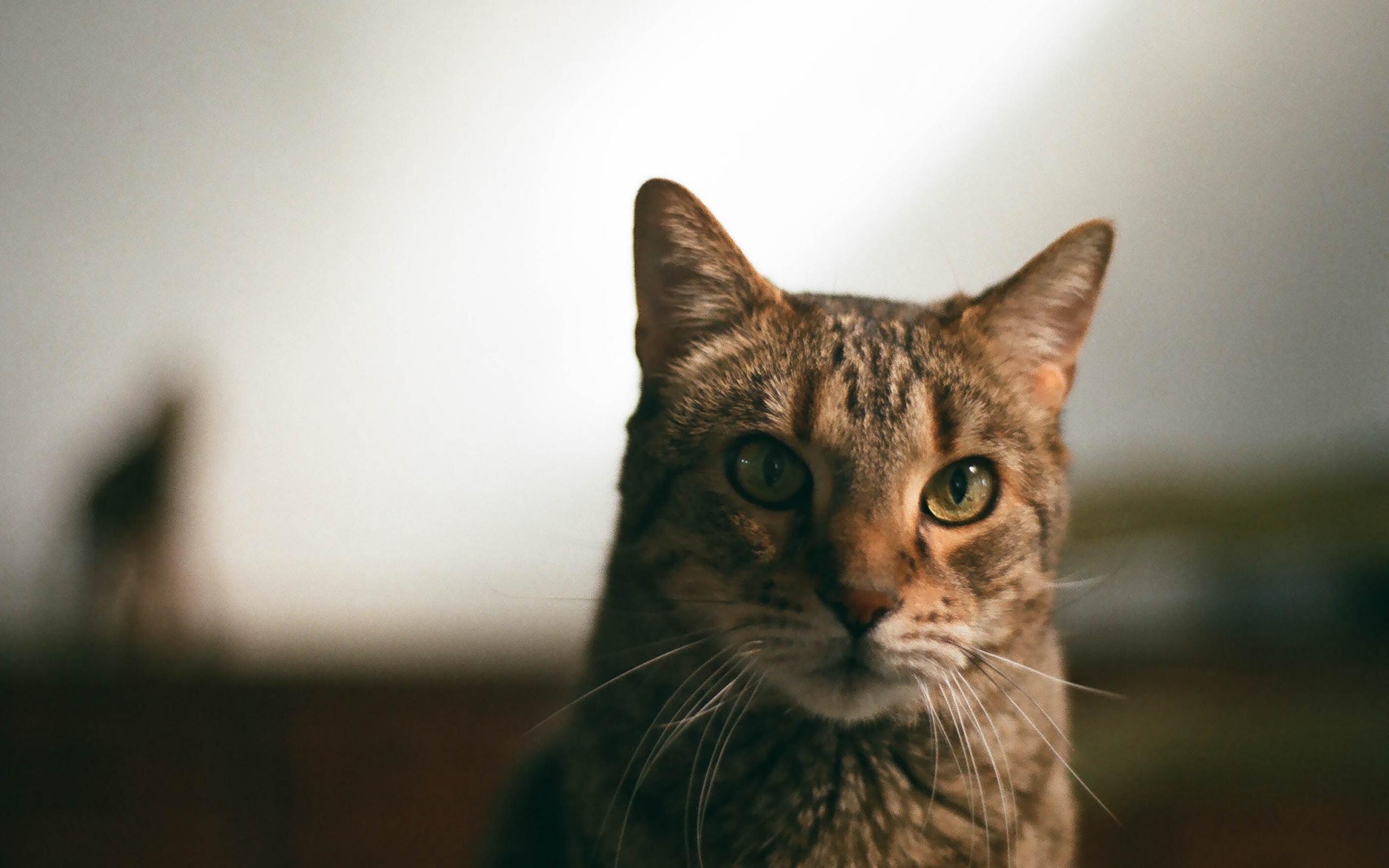 Description: A cat with a blurry background looks at the camera with a serious look on its face.