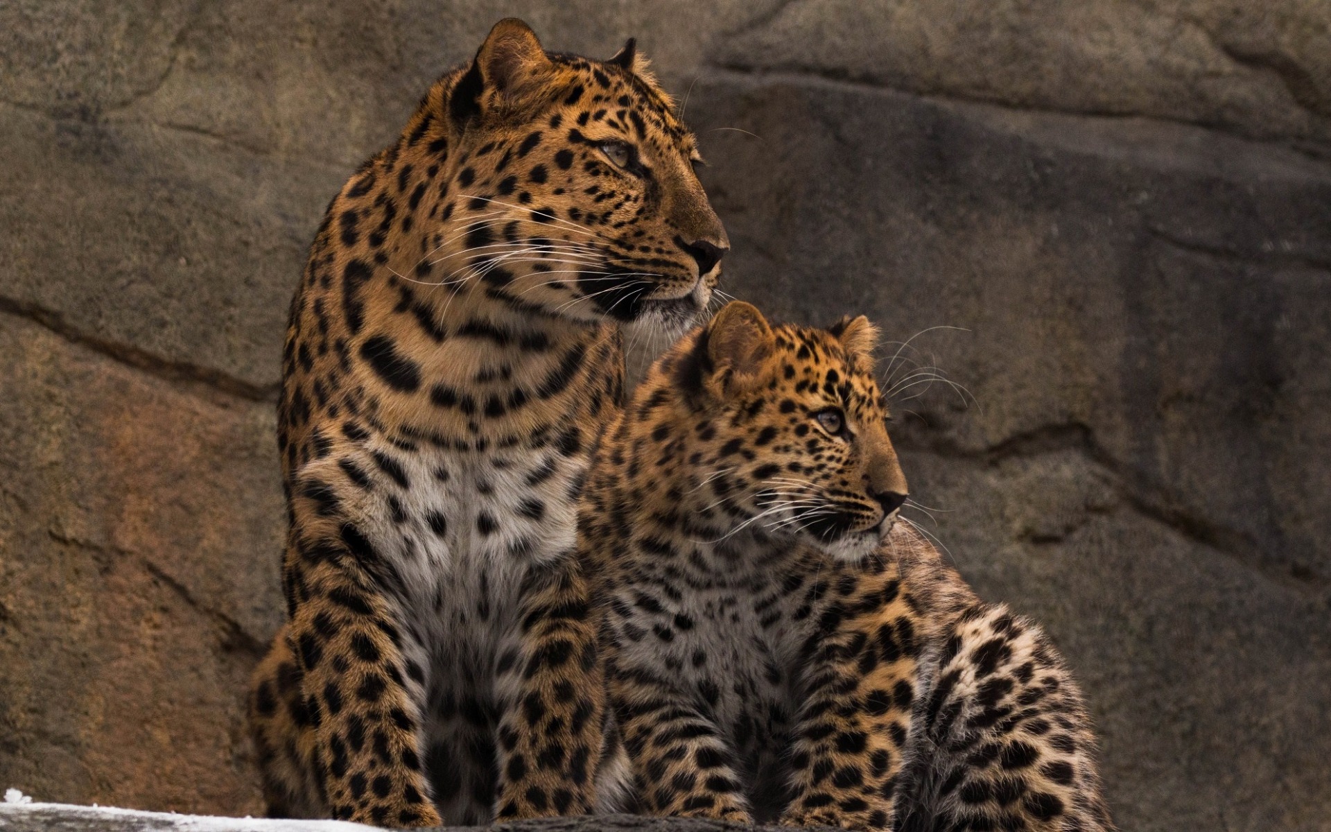 Description: A couple of animals that are standing in the dirt together on a rock wall in the sun light.