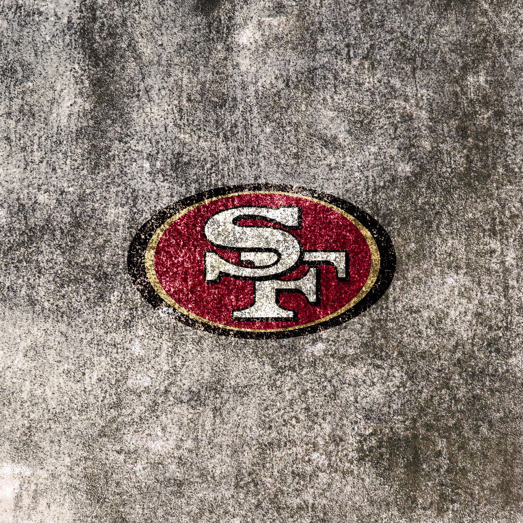 Description: A san francisco state emblem on a concrete surface with a red and white stripe on the bottom of the circle.