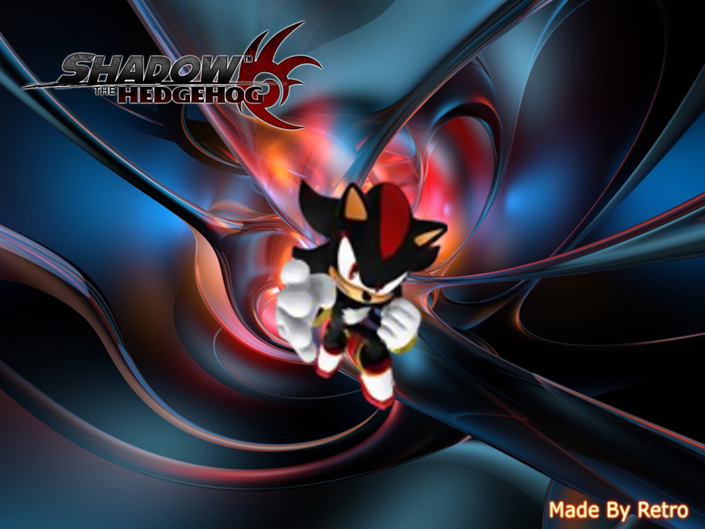 Description: A cartoon character is in a black and red background with a red and blue swirl around it and the words shadow the hedgehog.