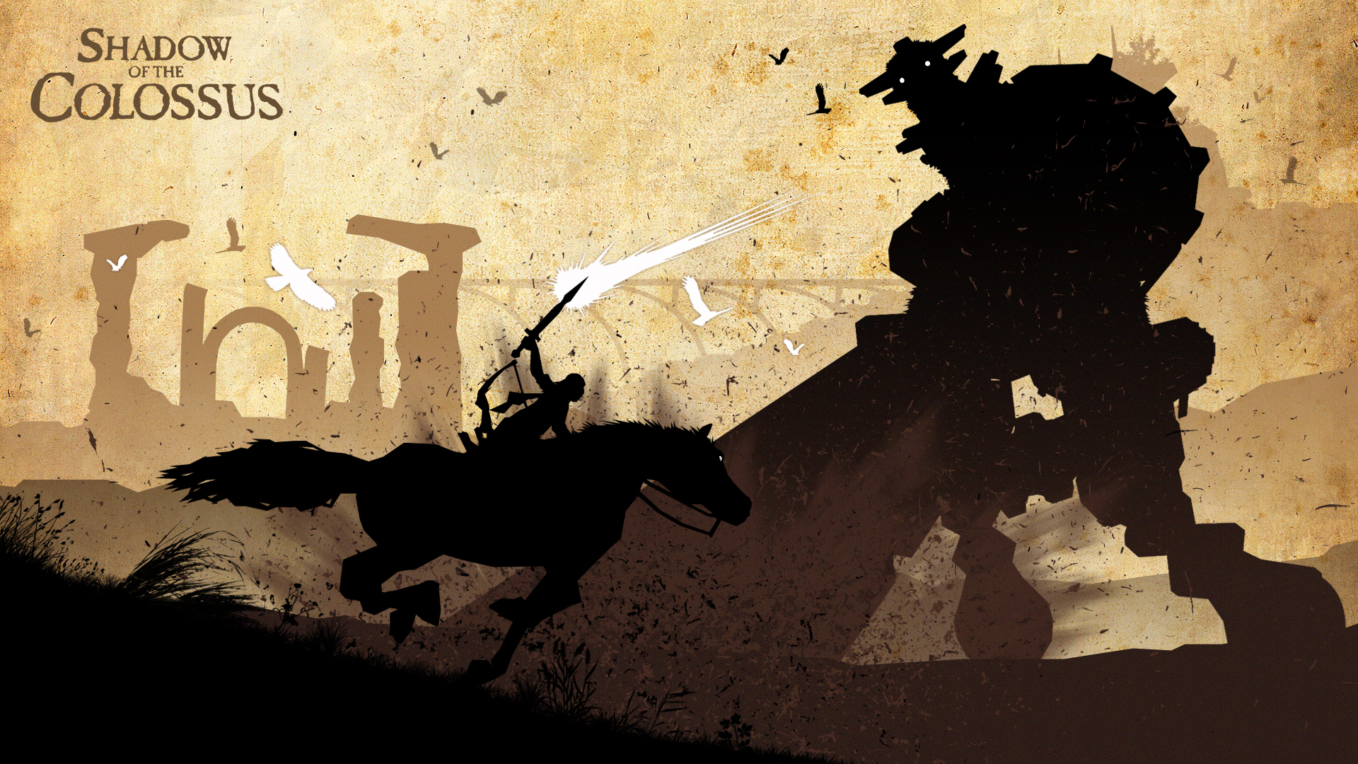 Description: A shadow of a man riding a horse next to a giant robot with a sword in his hand and a bird flying above.