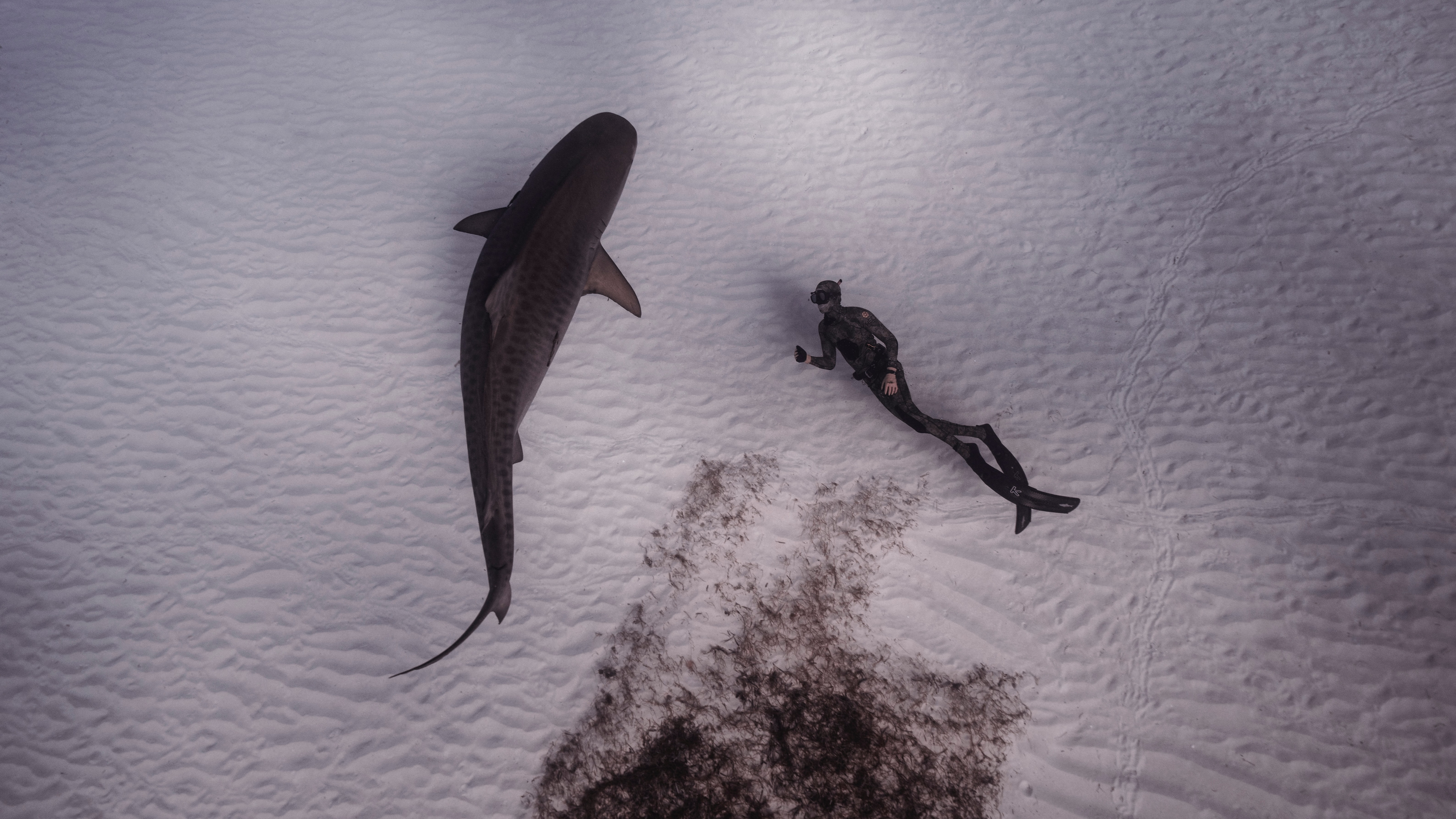 Description: A shark and a man are in the snow together.