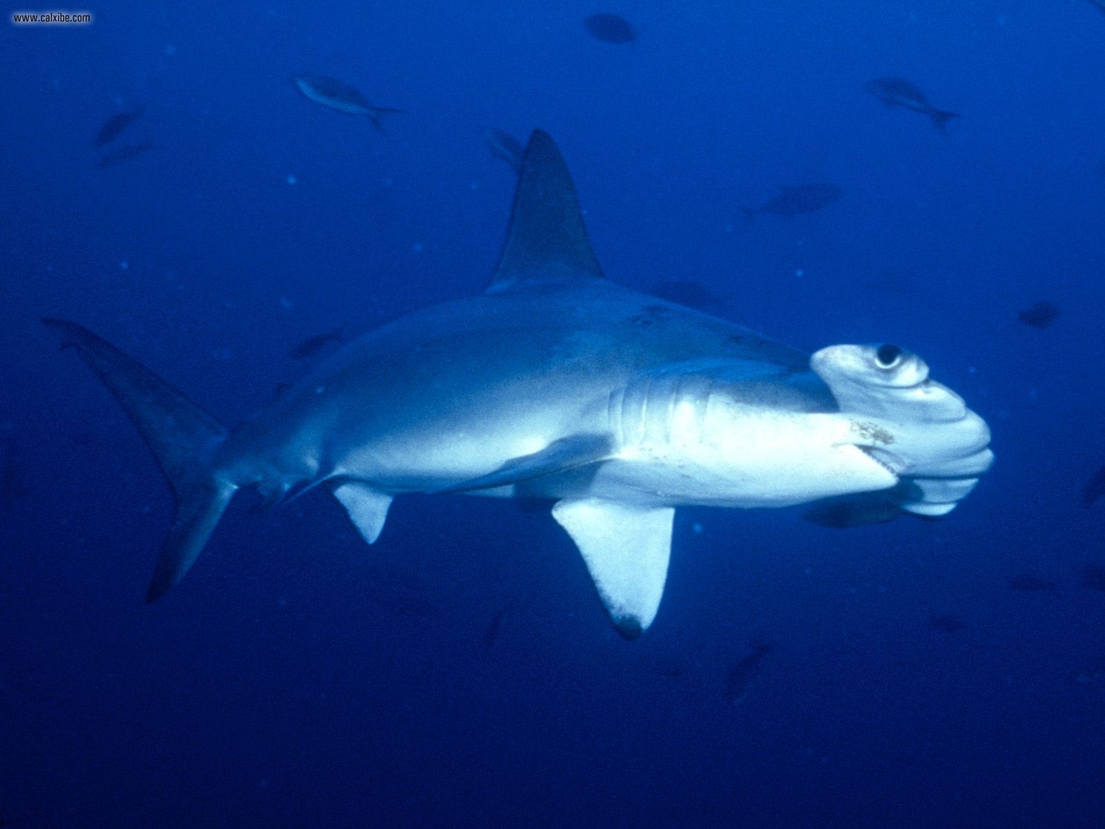 Description: A large shark swimming in the ocean with a person holding it's mouth open and a fish nearby.