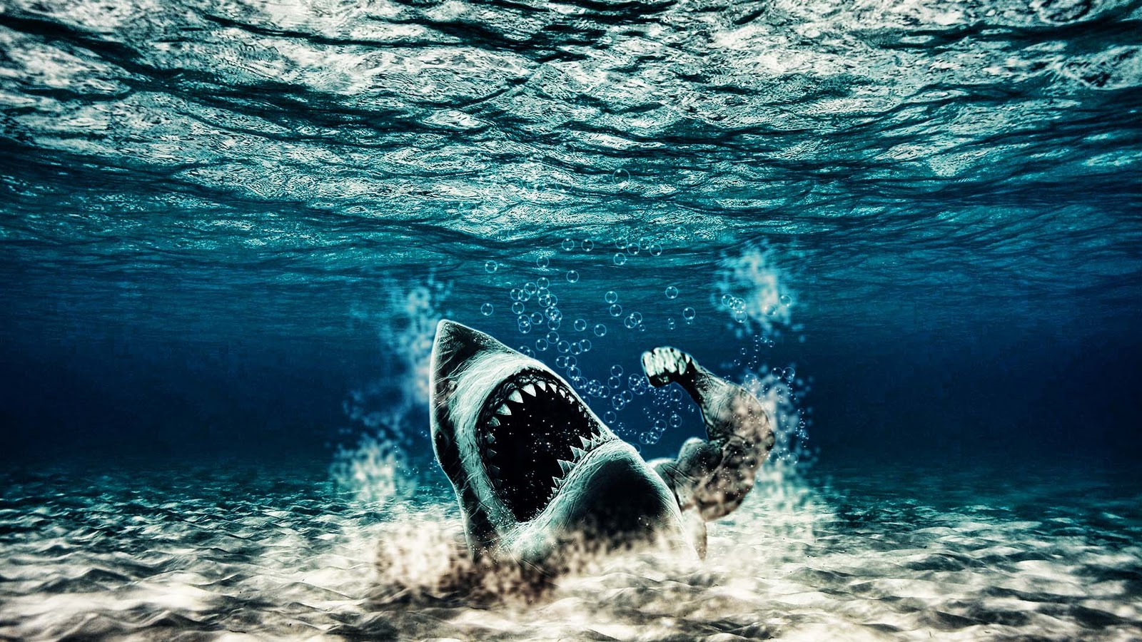 Description: A shark swimming in the ocean with its mouth open and it's teeth out and it's mouth out.