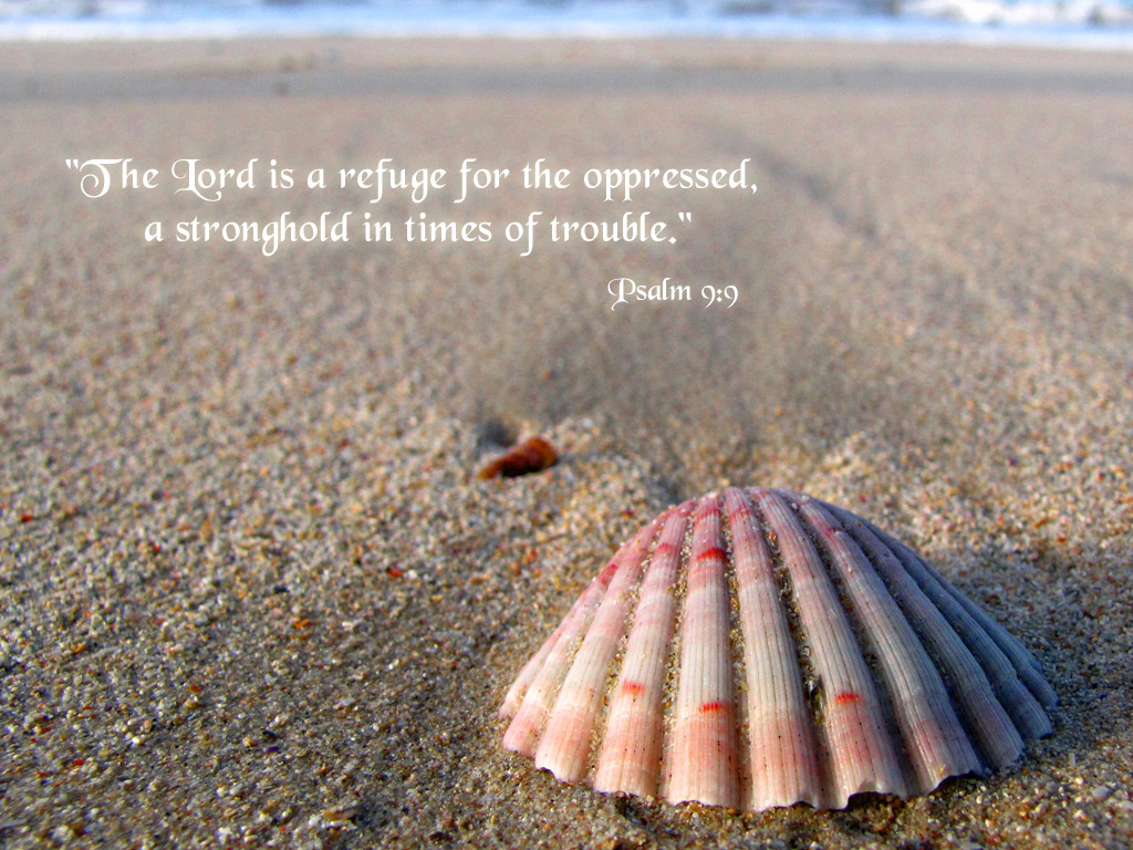 Description: A shell on the beach with a bible verse written on it's side and a wave coming in.