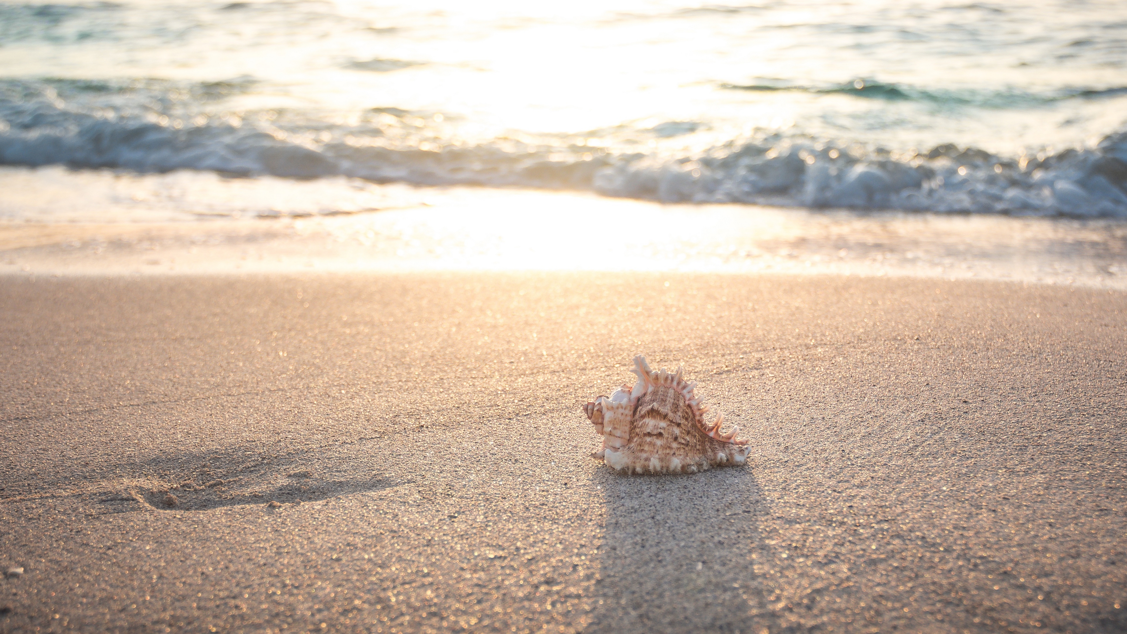 Description: A shell on the beach with the sun shining in the background and the water crashing in the background.