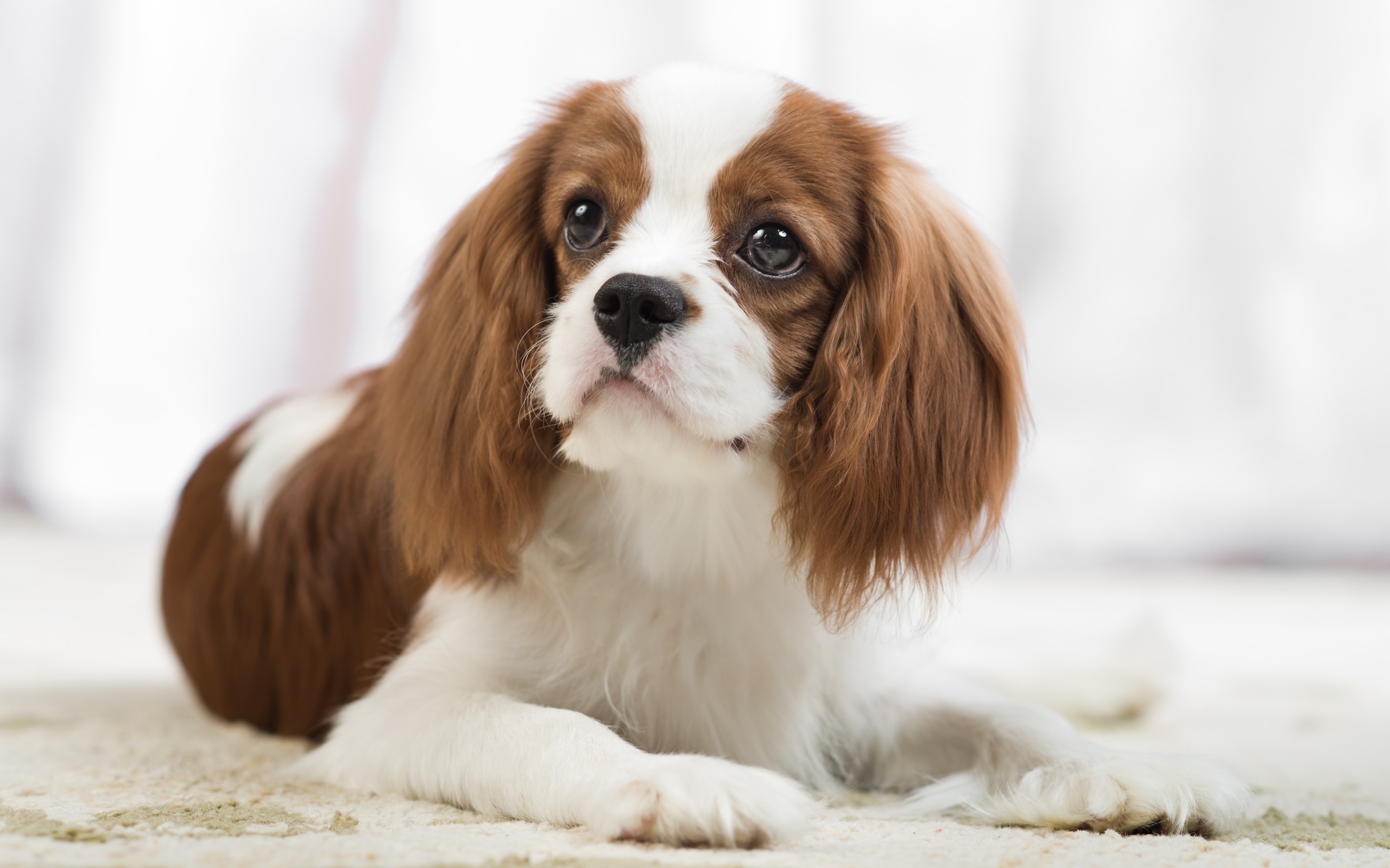 Description: A small brown and white dog laying on a carpet with a white curtain in the background and a white curtain in the background.