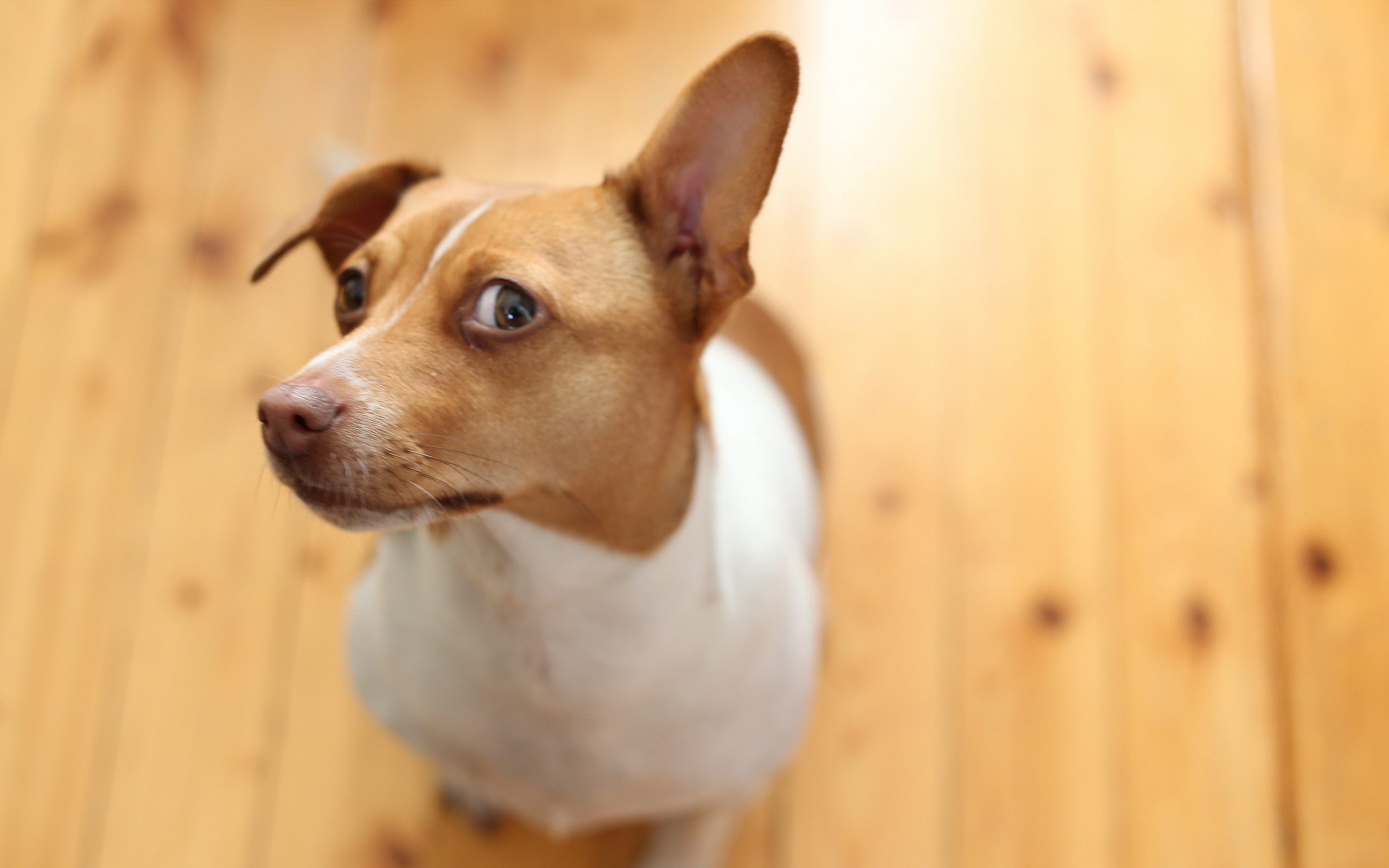 Description: A dog is looking up at the camera on a wooden floor with a wooden flooring surface in the background.