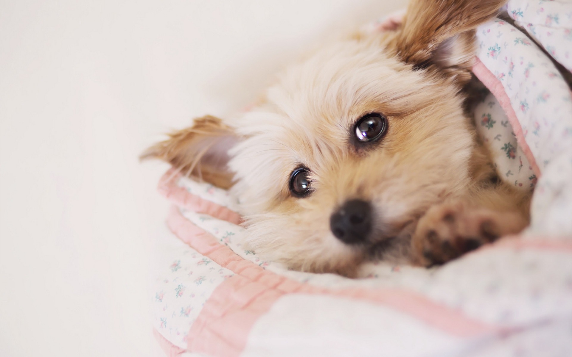 Description: A small dog laying on top of a bed under a blanket on top of a bed coverlet on a white floor.