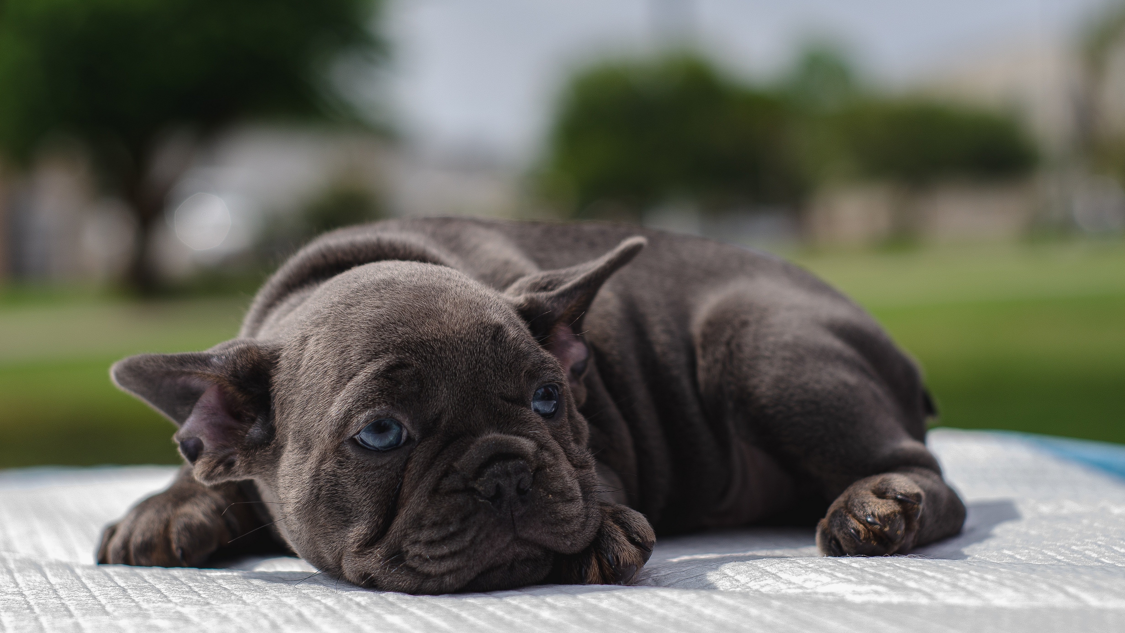 Description: A small dog laying on top of a white surface next to a green field and trees in the background.