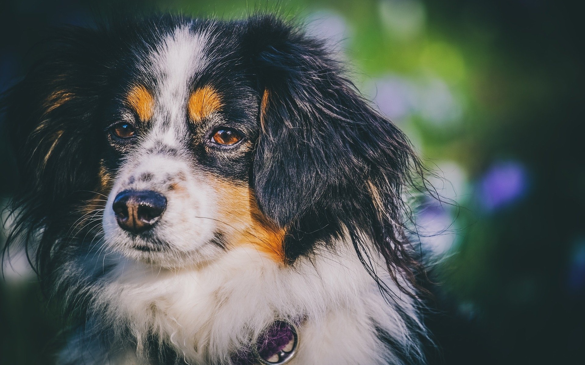 Description: A dog with a collar looking at the camera with a blurry background of flowers in the background and a blurry background of the dog.
