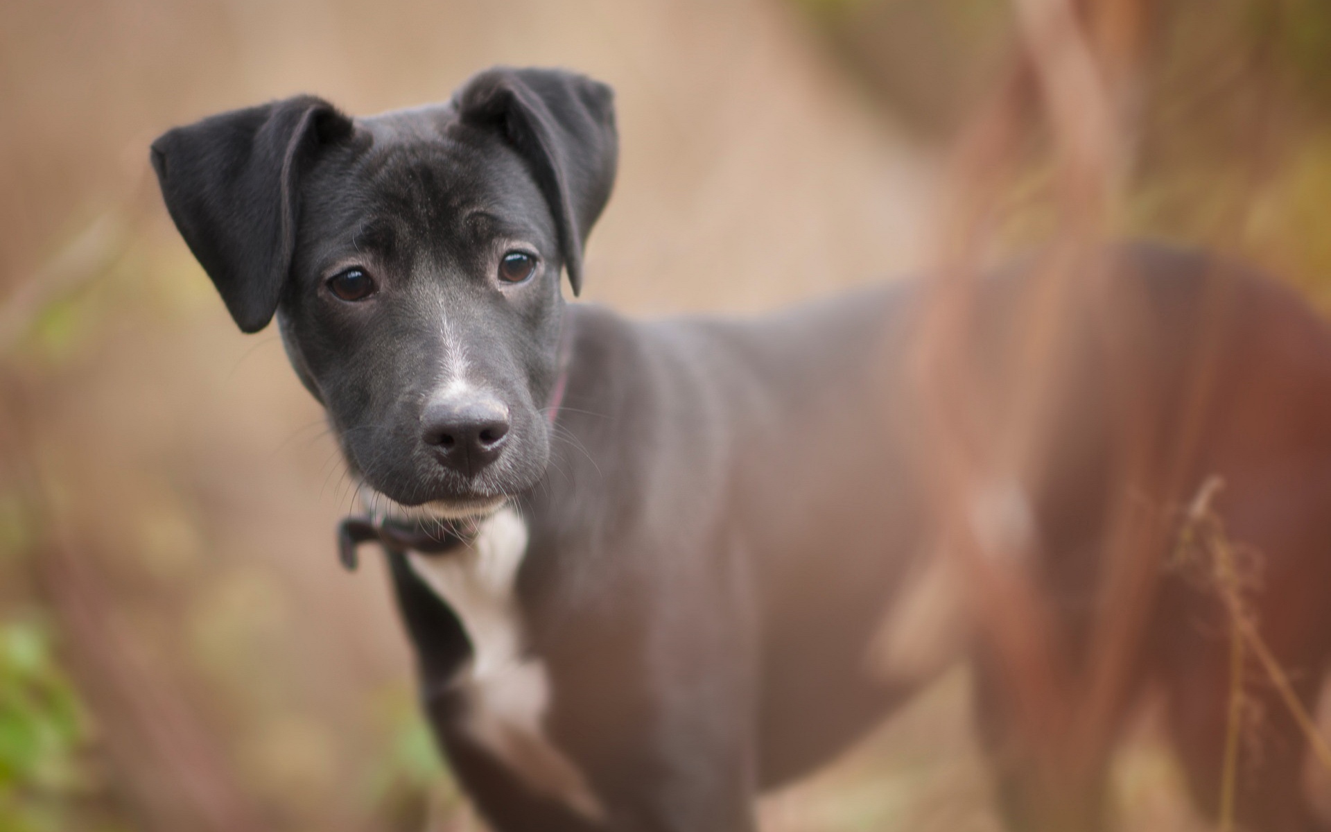 Description: A black and white dog standing in a field of grass and weeds with a blurry background of grass and weeds.