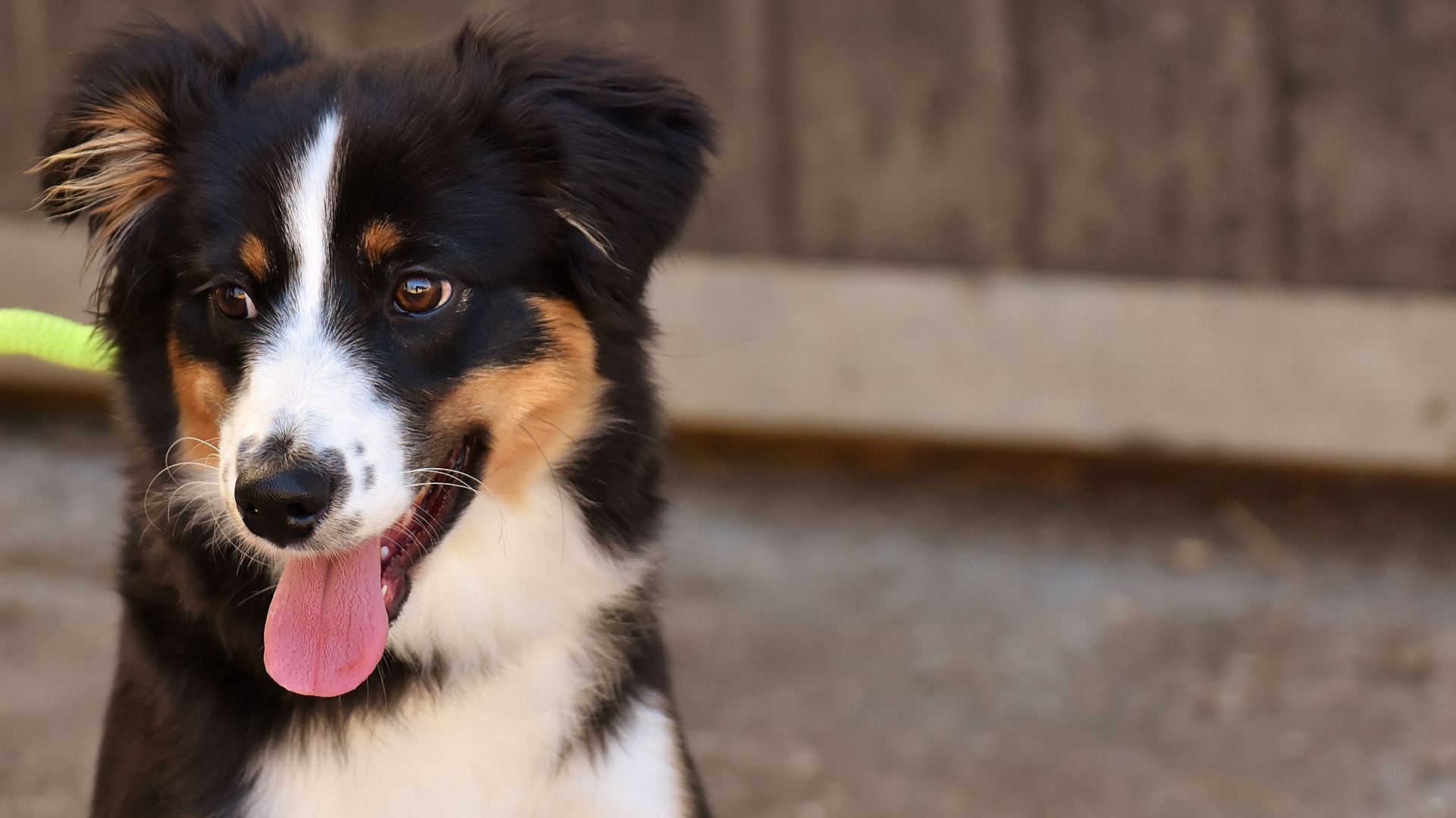 Description: A dog with a frisbee in its mouth is looking at the camera while standing on the sidewalk.