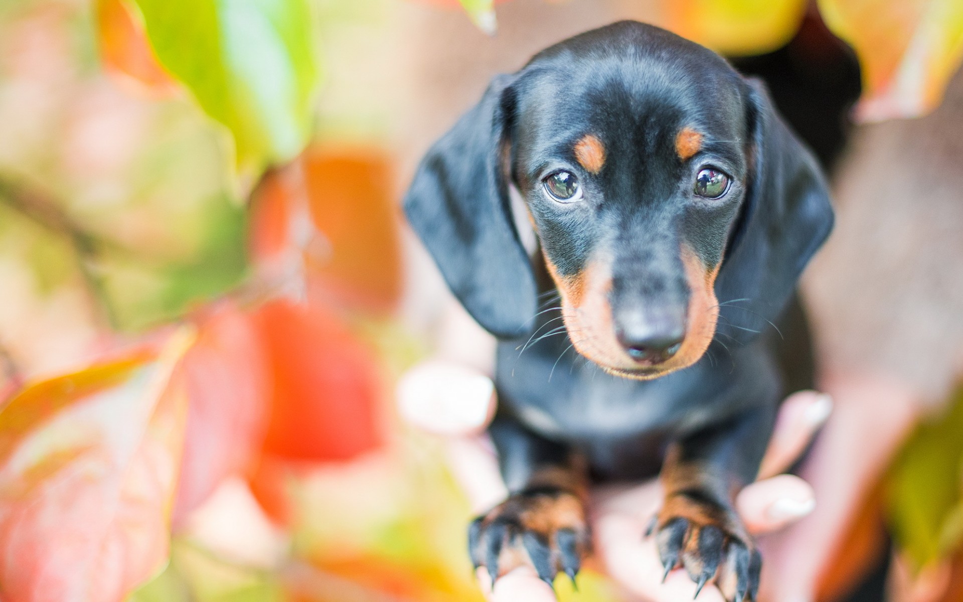 Description: A small black and brown dog sitting on top of a persons hand in a tree with leaves around it.