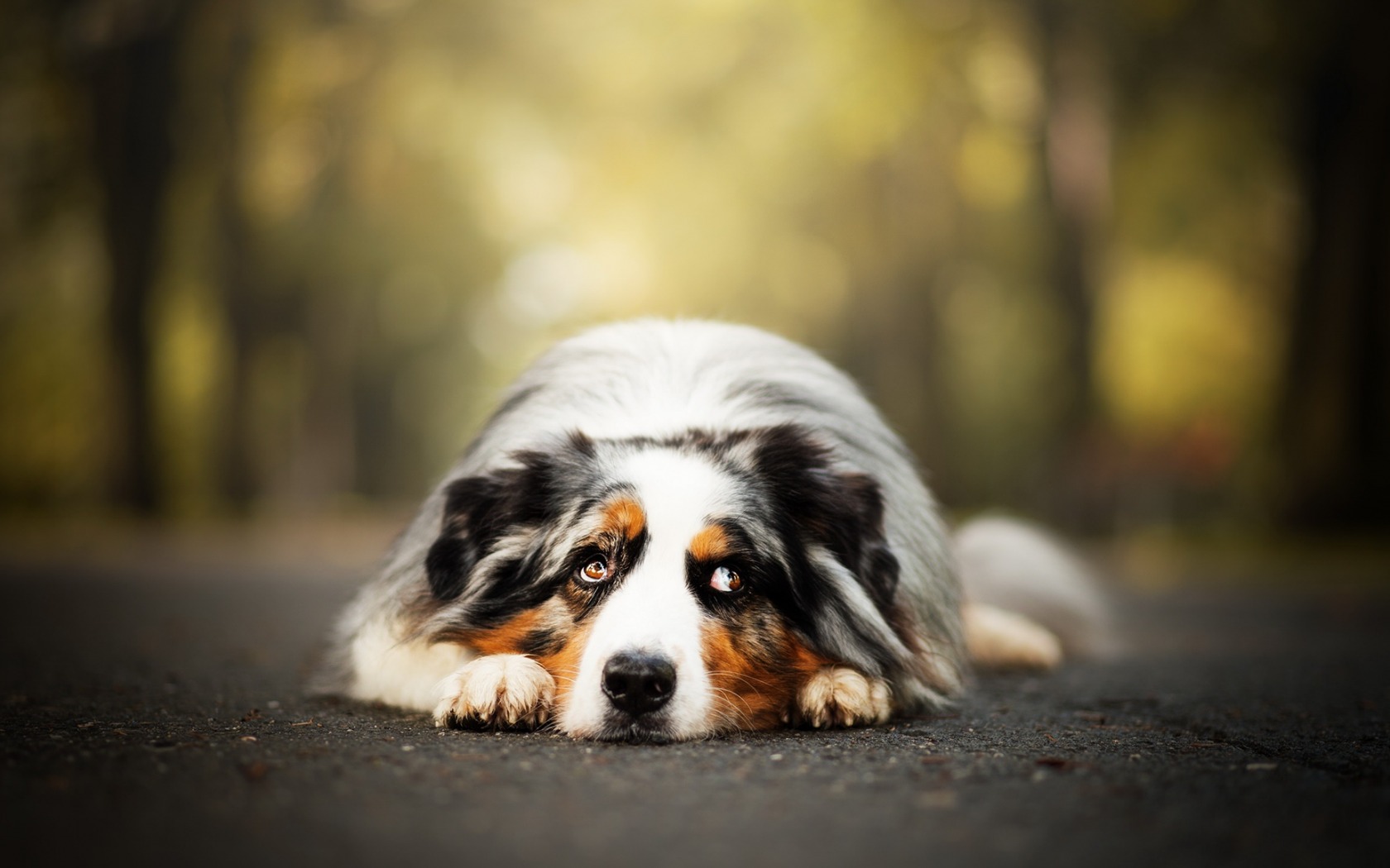 Description: A dog laying on the ground in the middle of the road with trees in the background and a blurry background.