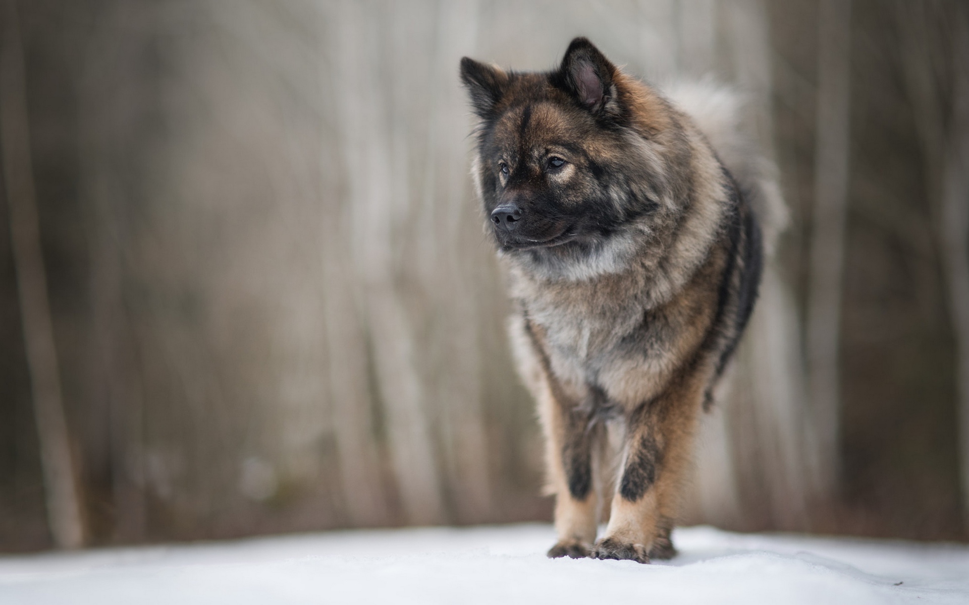 Description: A dog that is standing in the snow near trees and snow covered ground with a blurry background of trees.