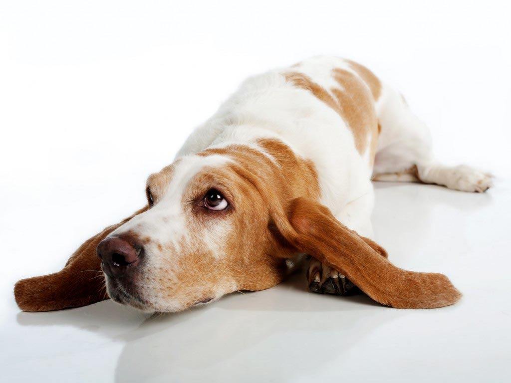 Description: A dog laying on the floor with its head on the ground looking up at something with its eyes closed.