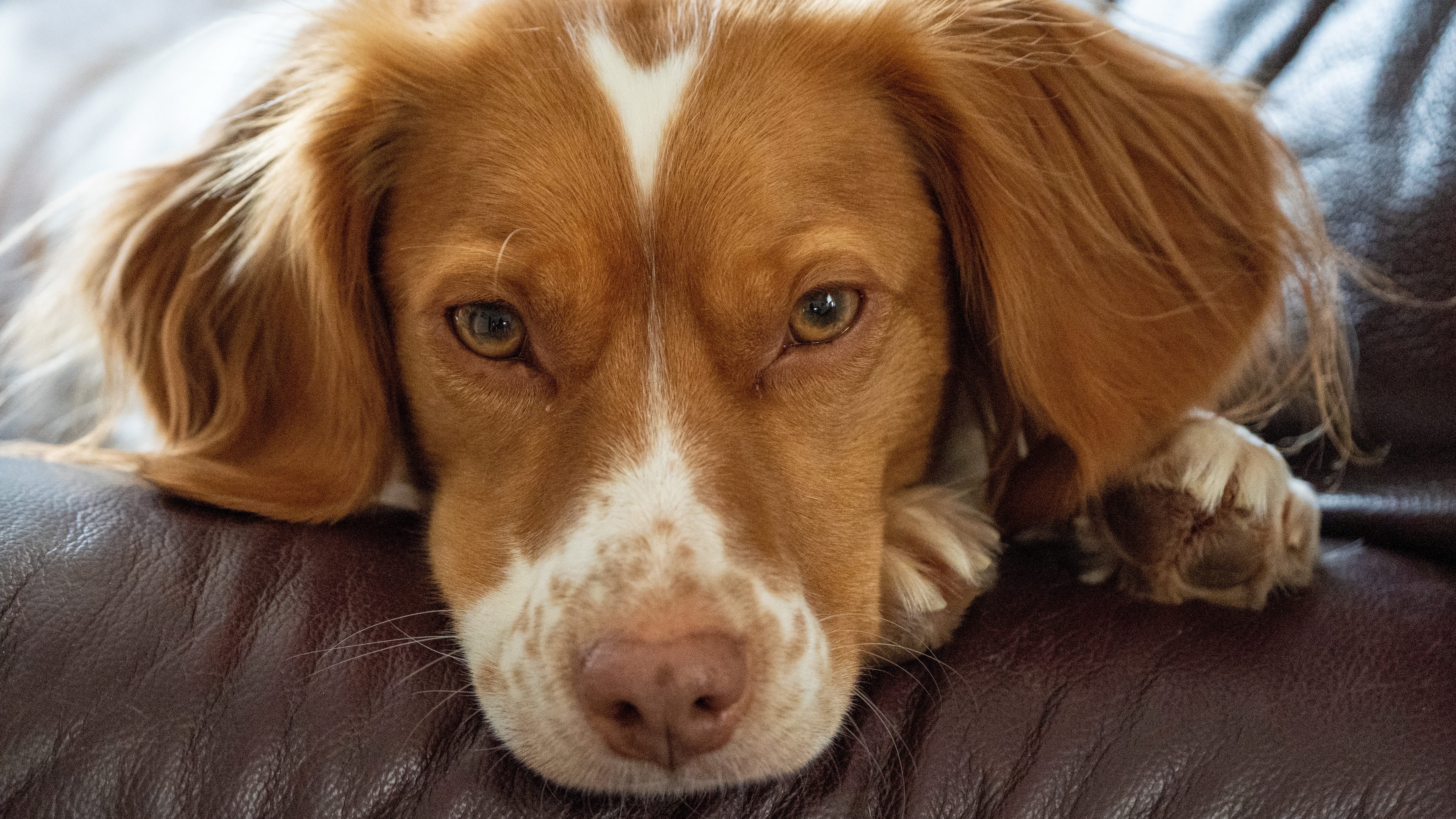 Description: A dog laying on a leather couch with his head resting on the arm of the couch.