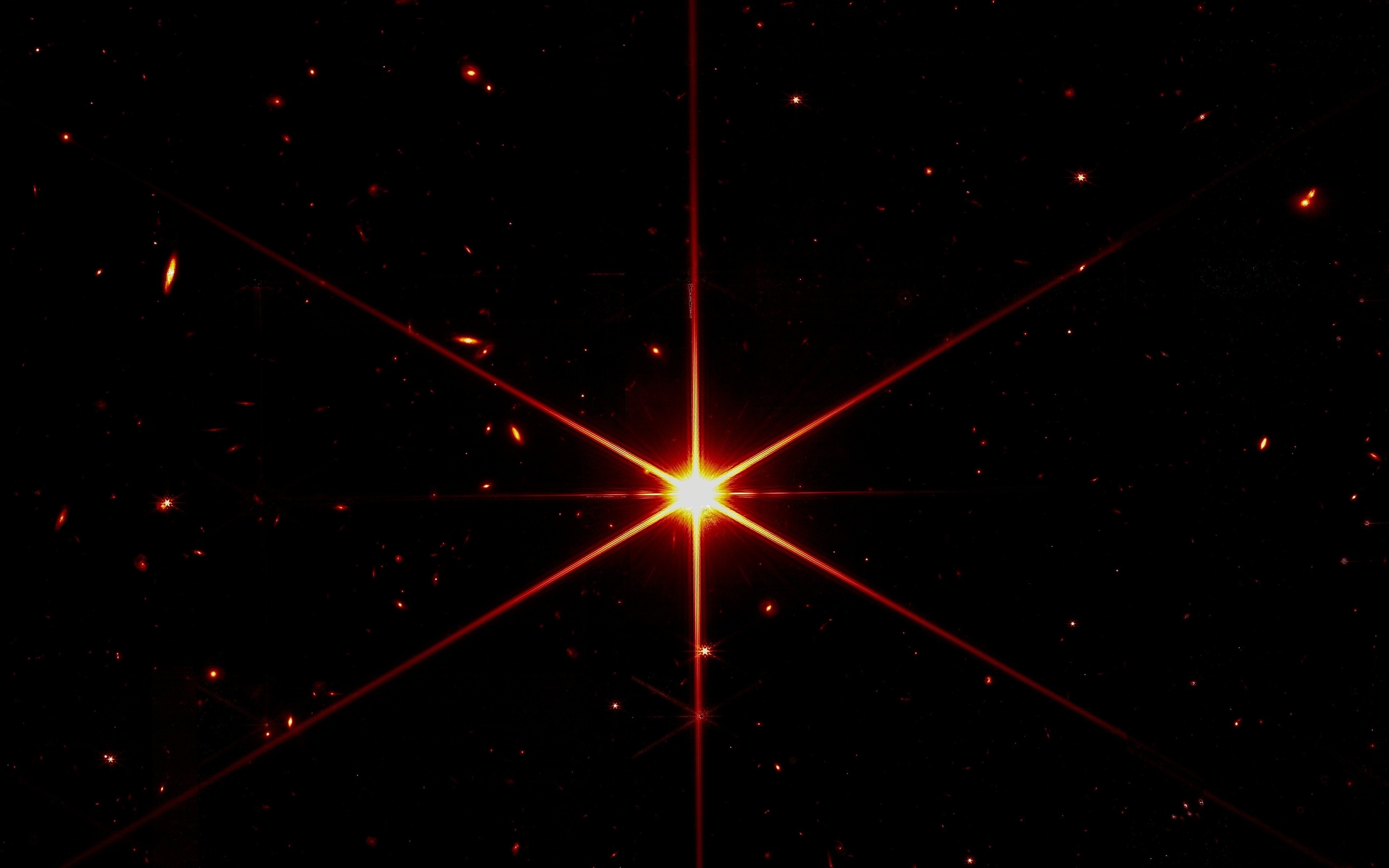 Description: A star is shining brightly in the dark sky with stars around it and a star in the center of the image.