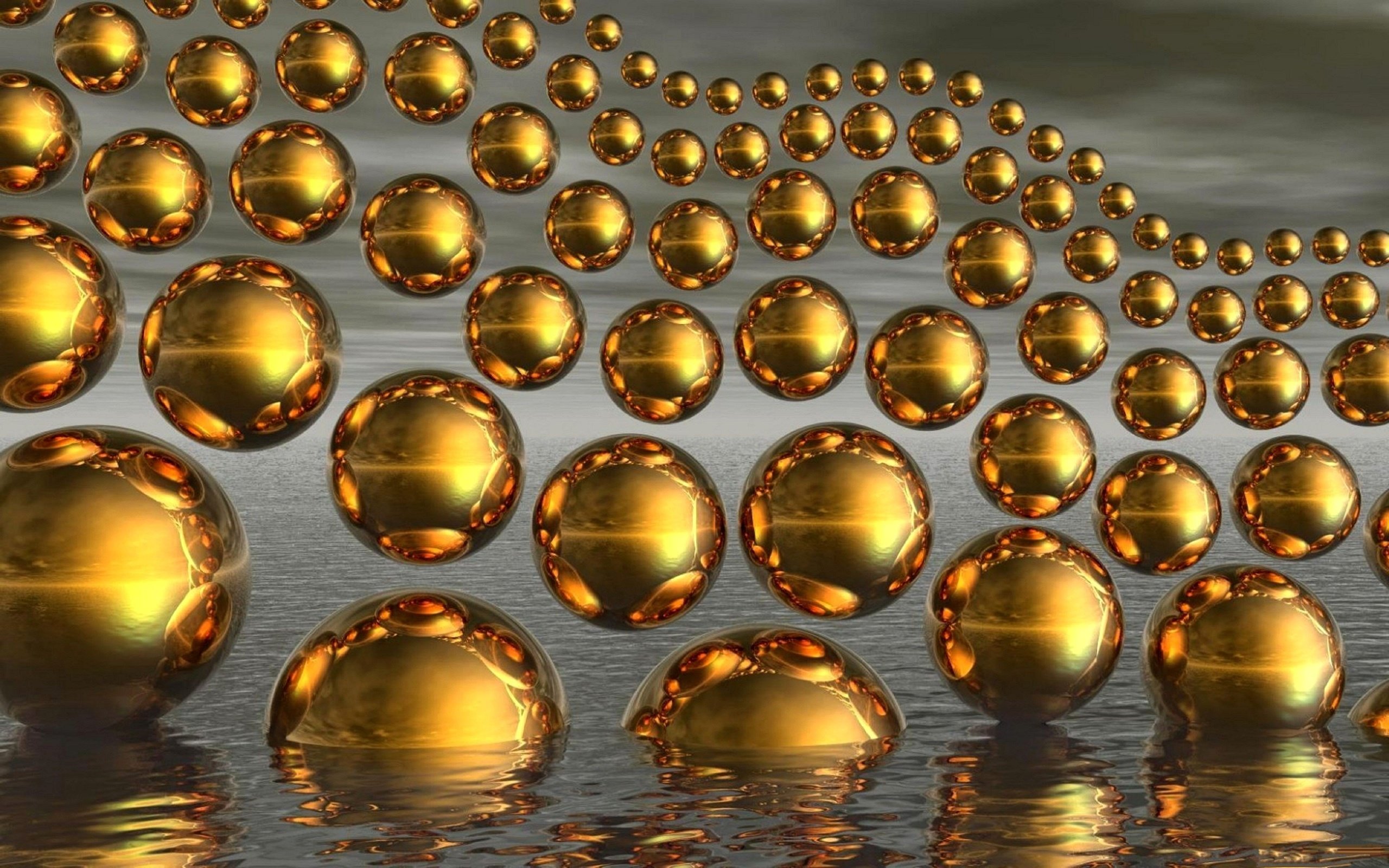 Description: A group of shiny balls floating on top of a body of water next to a wall of shiny gold balls.