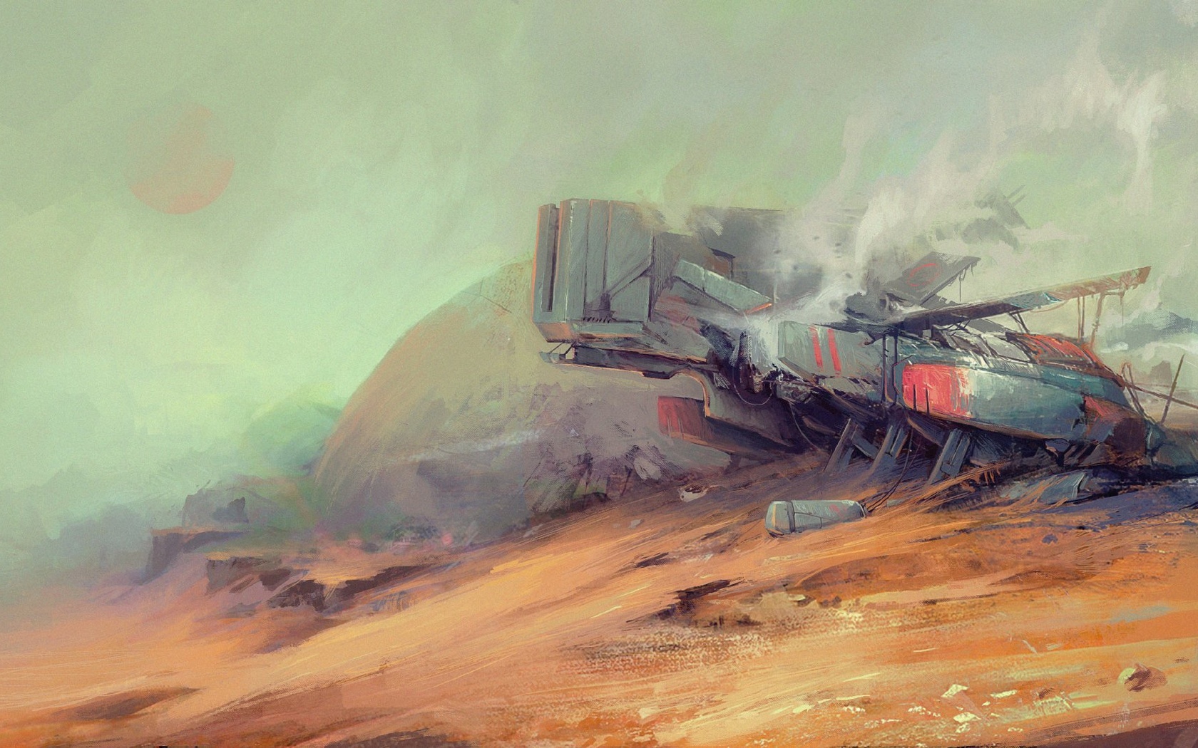 Description: A painting of a ship on a beach with smoke coming out of it's stacks of debris and debris.