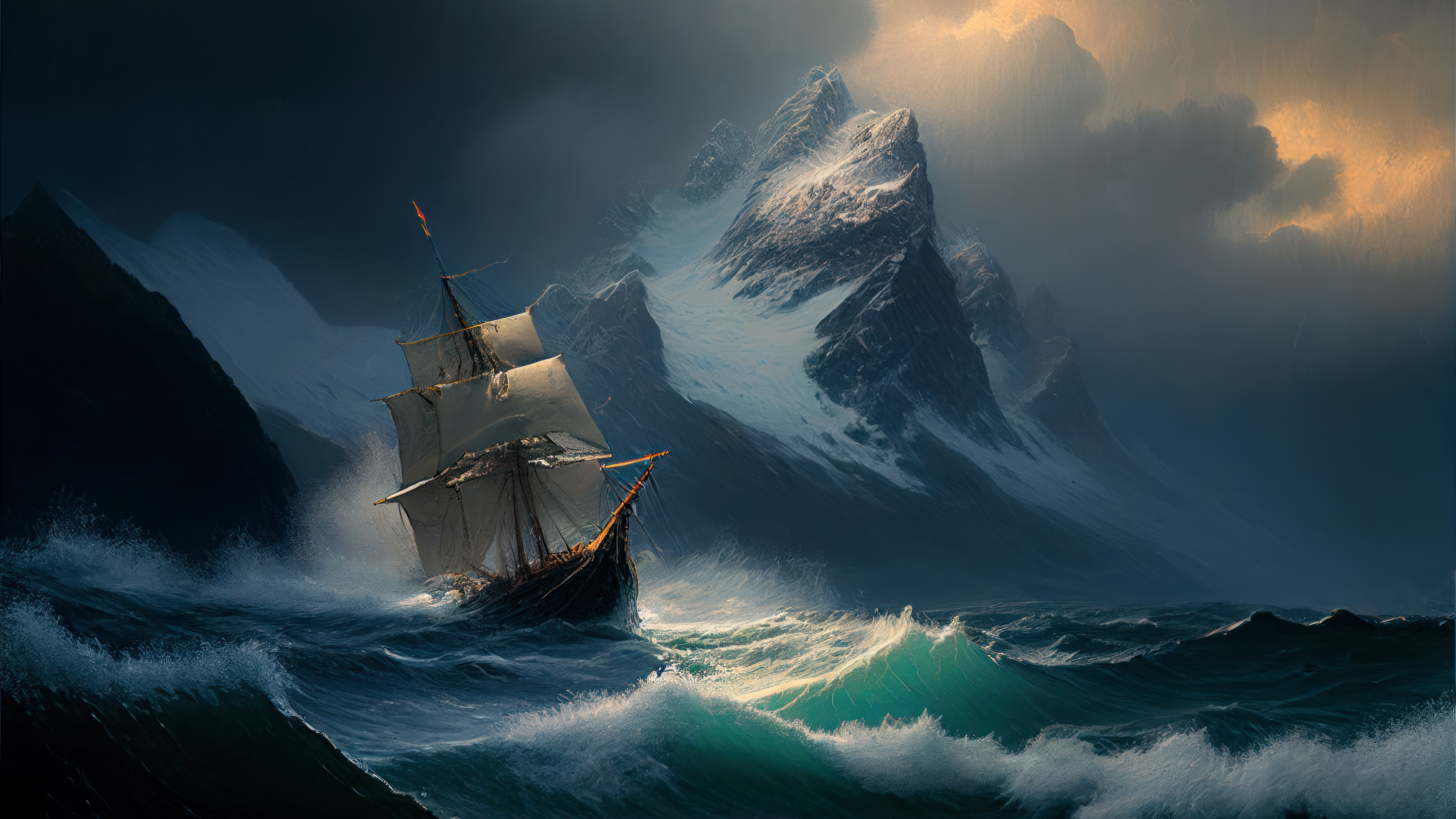 Description: A painting of a ship in rough seas with a mountain in the background and a cloudy sky above it.