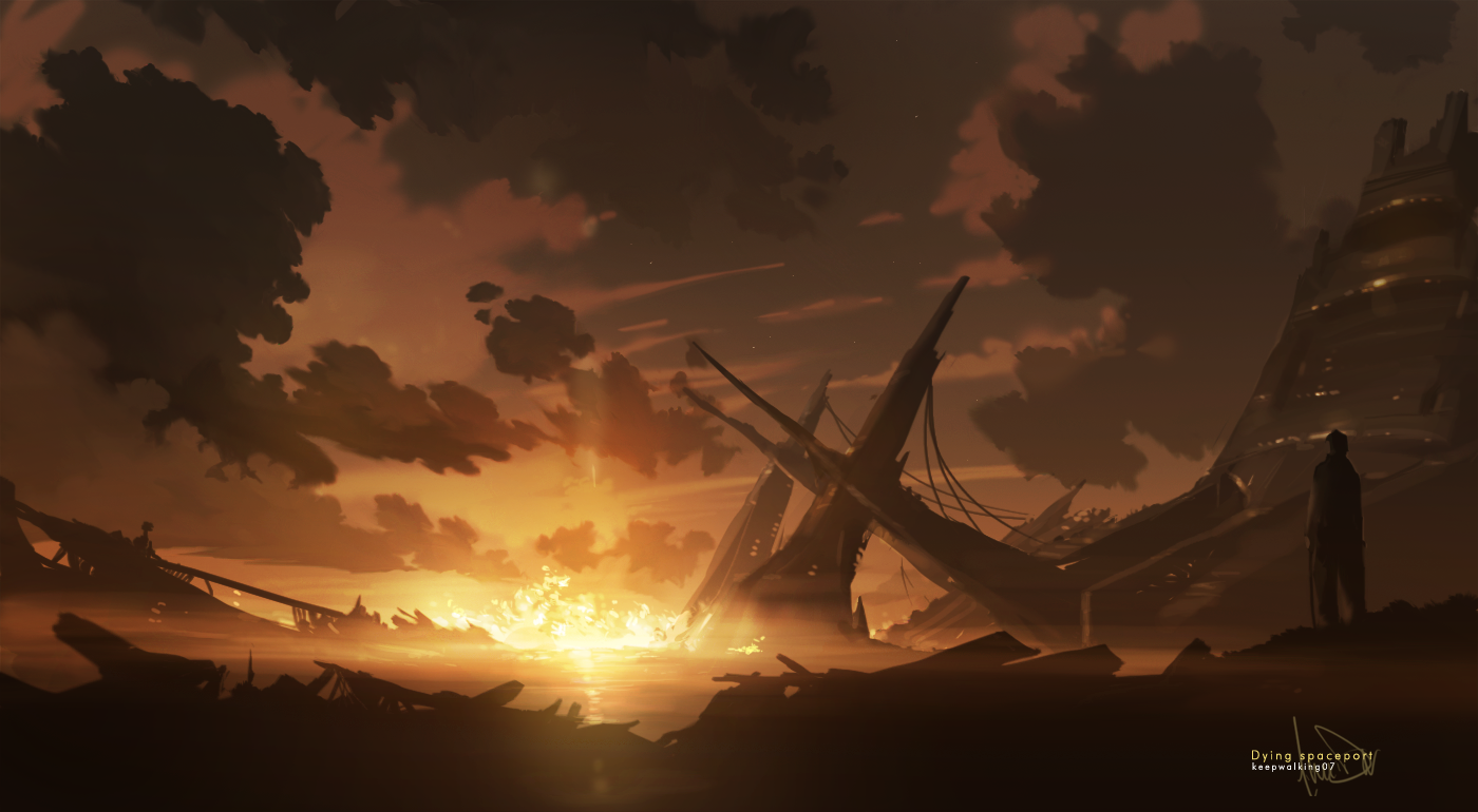Description: A painting of a ship in the ocean at sunset with a man standing on the shore looking at the sunset.