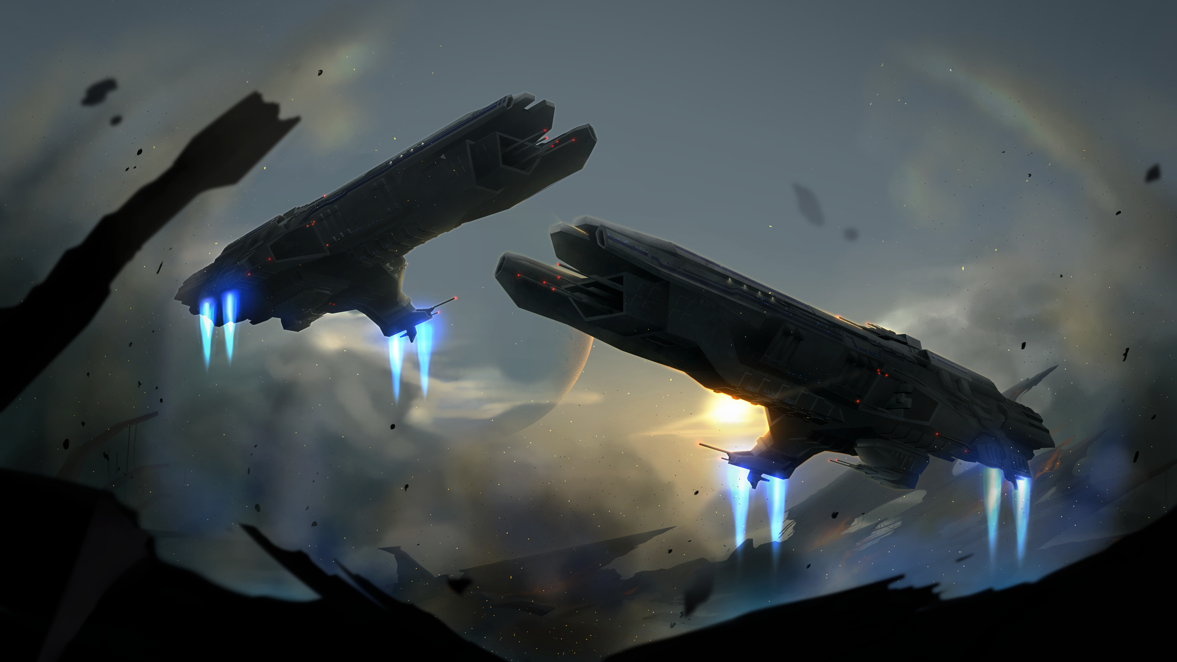 Description: A couple of ships flying through a cloudy sky next to each other on a mountain side with a rainbow in the background.