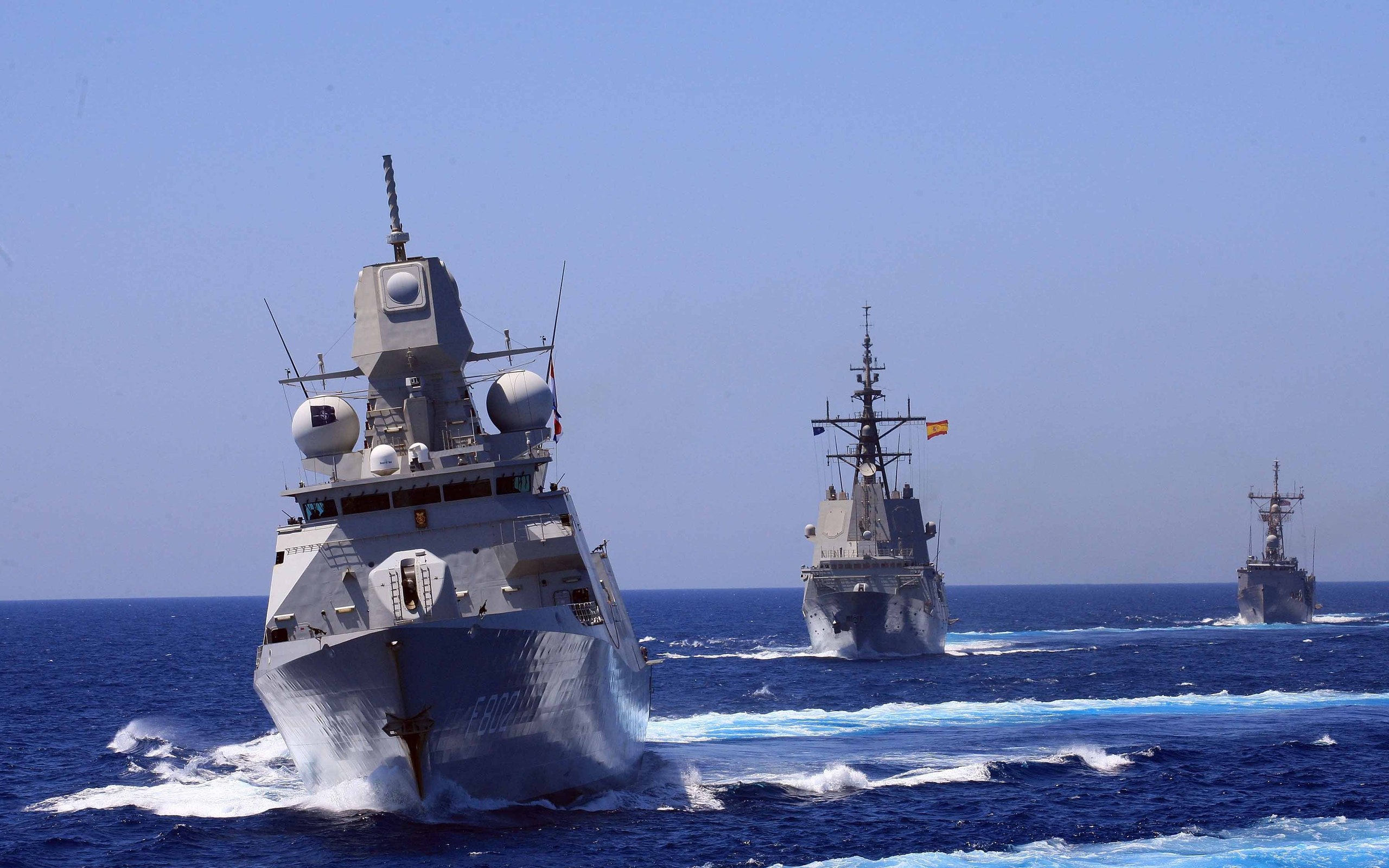 Description: A group of ships in the ocean with a sky background and a few clouds in the sky above them.
