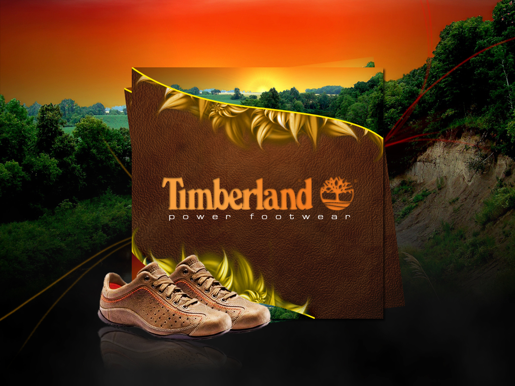 Description: A pair of shoes sitting on top of a box next to a road with a sign that reads timberland.